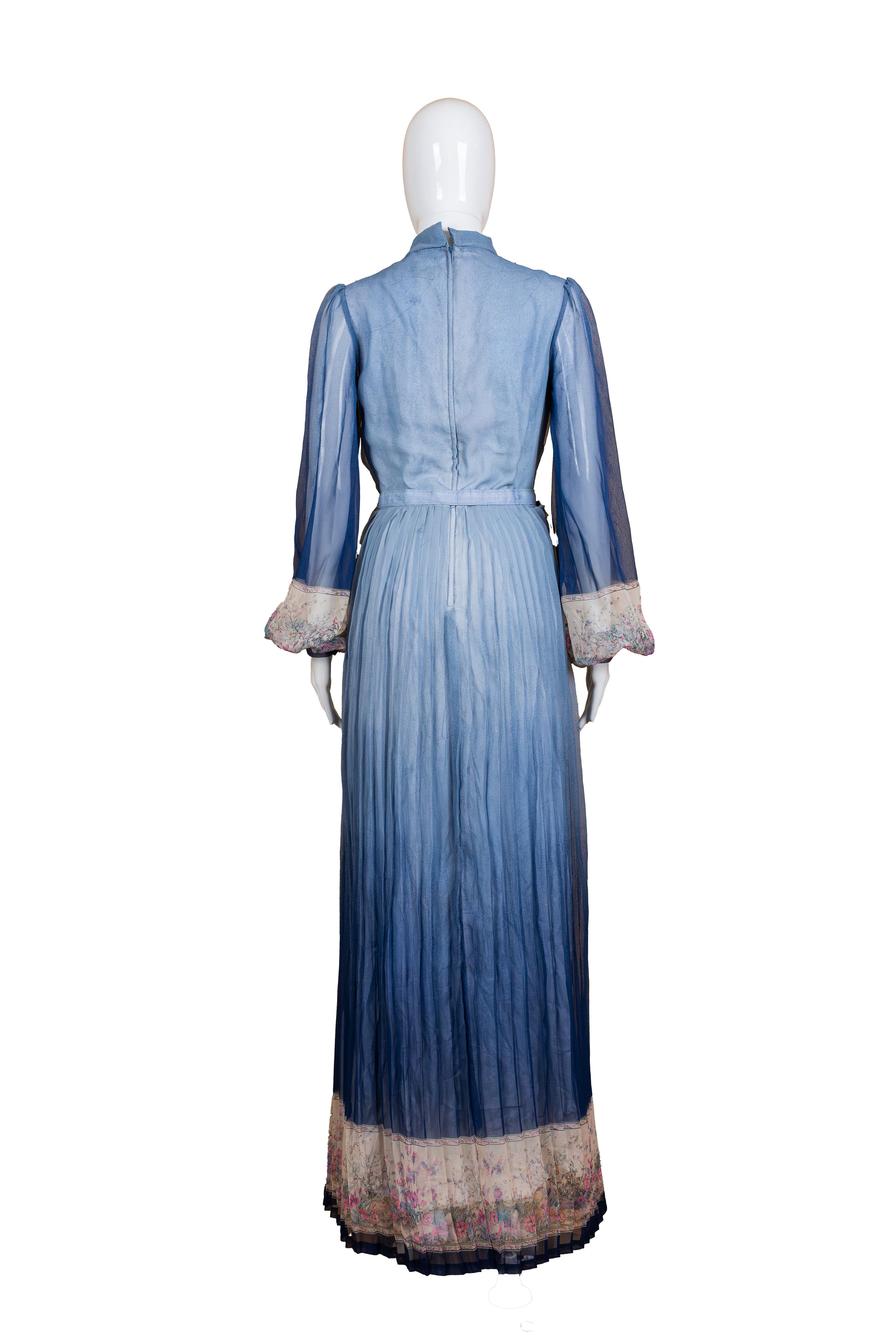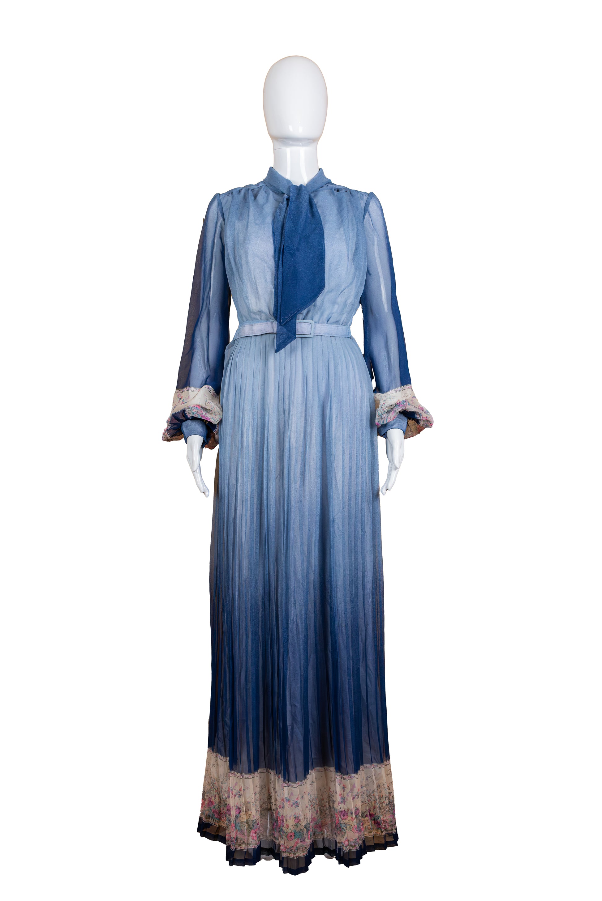 C&A vintage 70s síðkjóll. Blár chiffon kjóll, með plíseruðu pilsi og fallegu munstri á ermum og pilsi. Með belti. Renndur í bakið. 100% polyester. Engin teygja í efni. Lítil saumspretta í vinstri handarkrika en annars er ástand mjög gott. Merkt stærð 40. Áætluð stærð XS.
