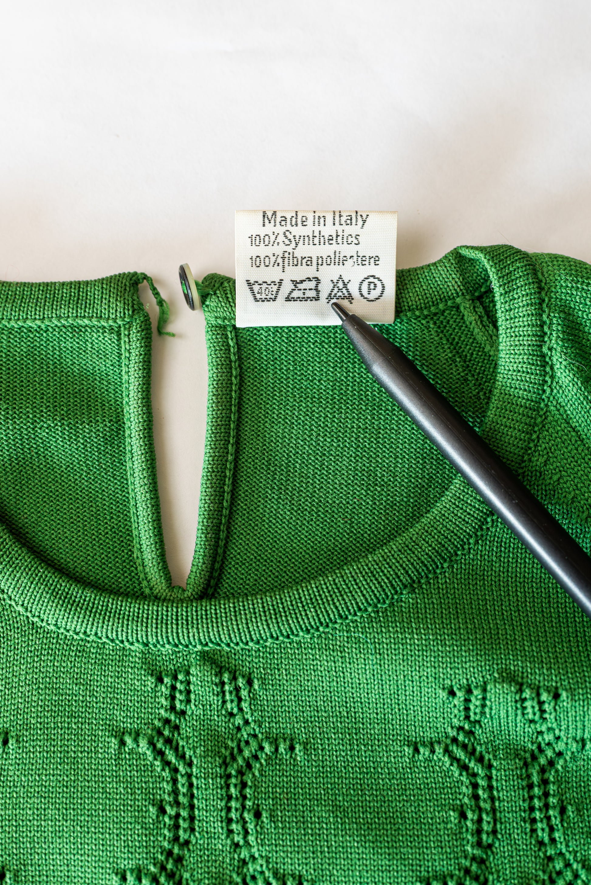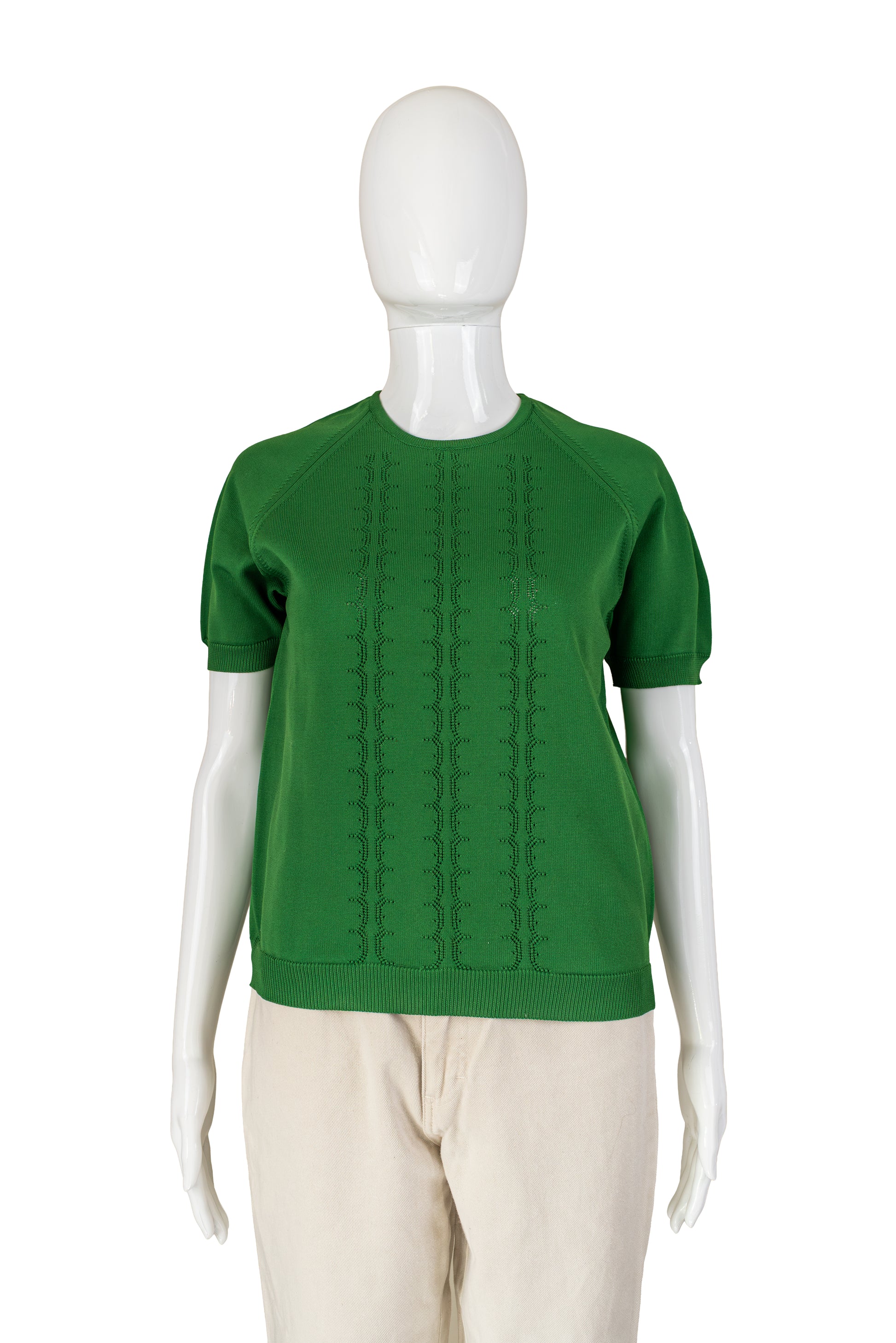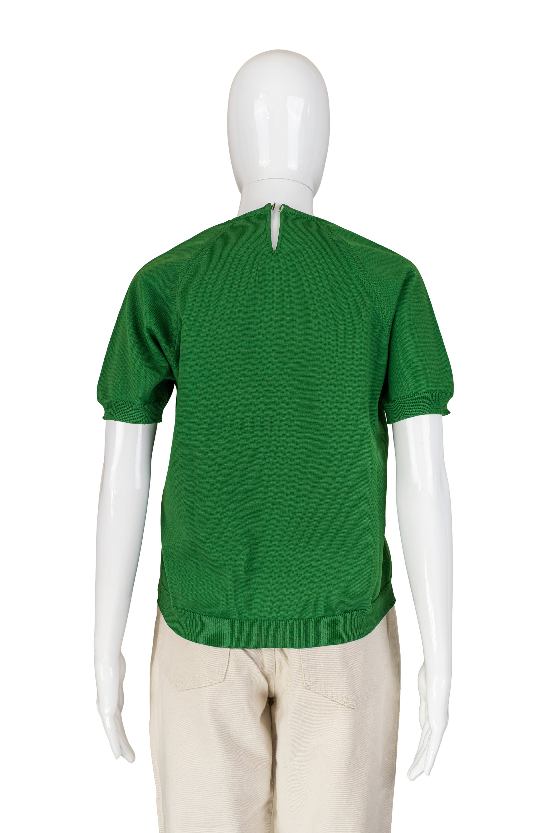 Crimplene græn vintage prjónapeysa. Stutterma. 100% polyester. Lykkja fyrir tölu slitin annars er peysan eins og ónotuð. Mæld stærð S - M.