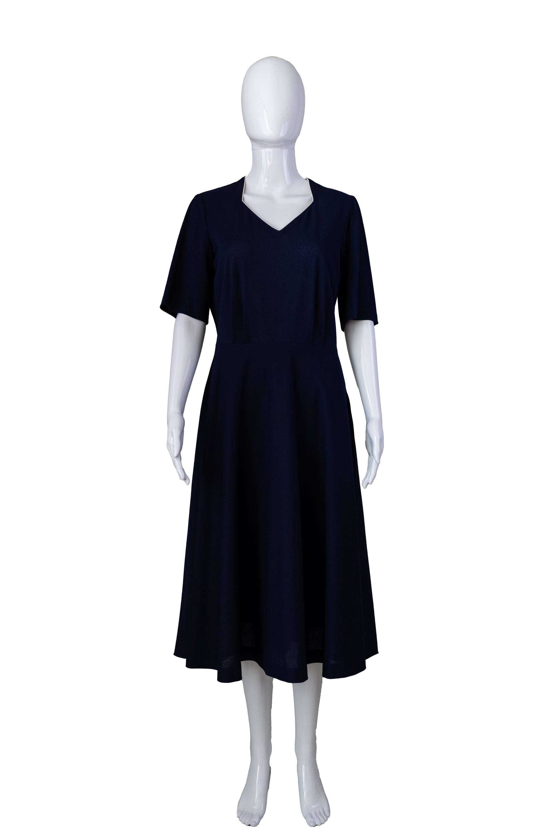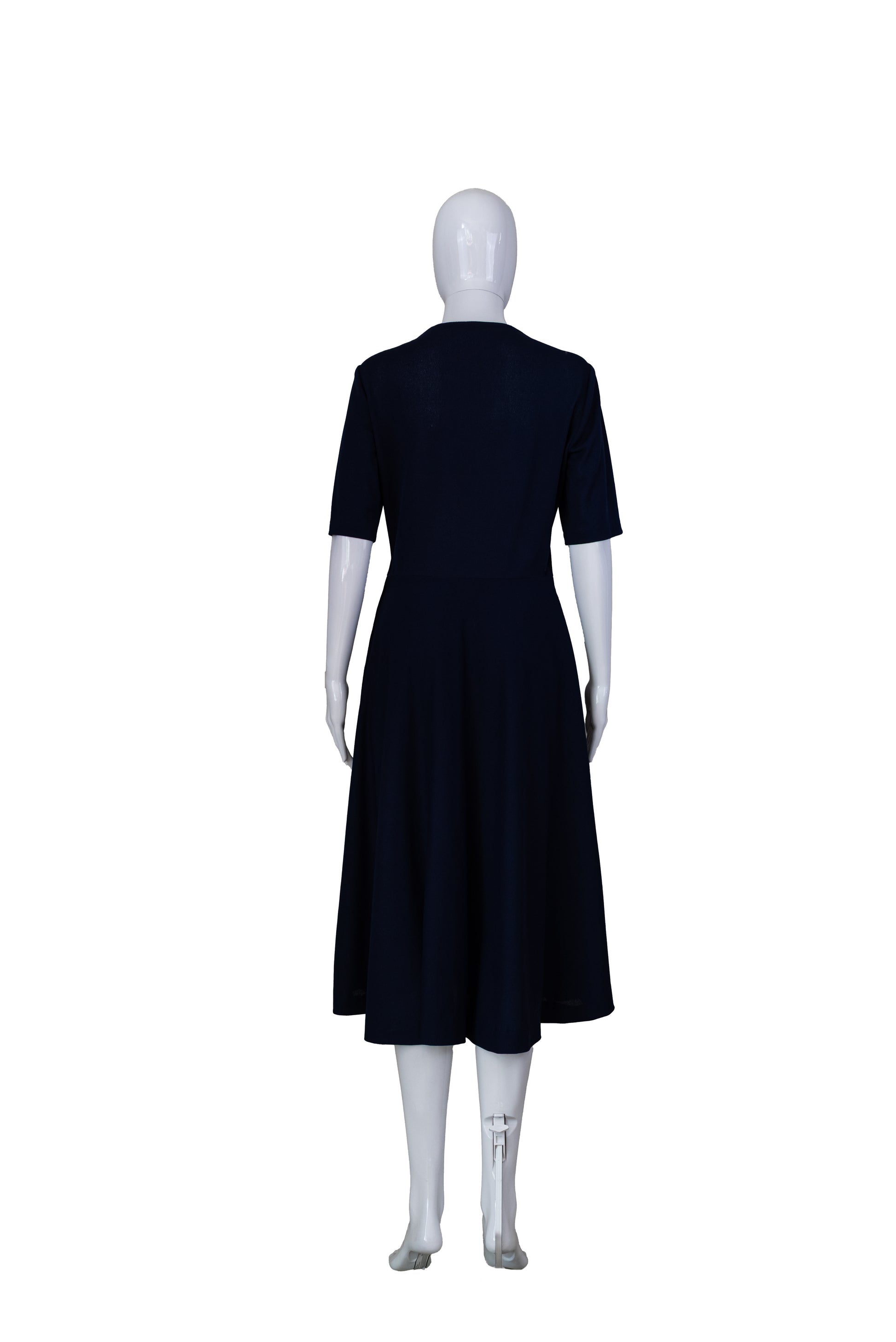 Ómerktur vintage 80s kjóll. Dökkblár. Rennilás á hlið. Smá teygja í efni. Ástand gott. Stærð S.