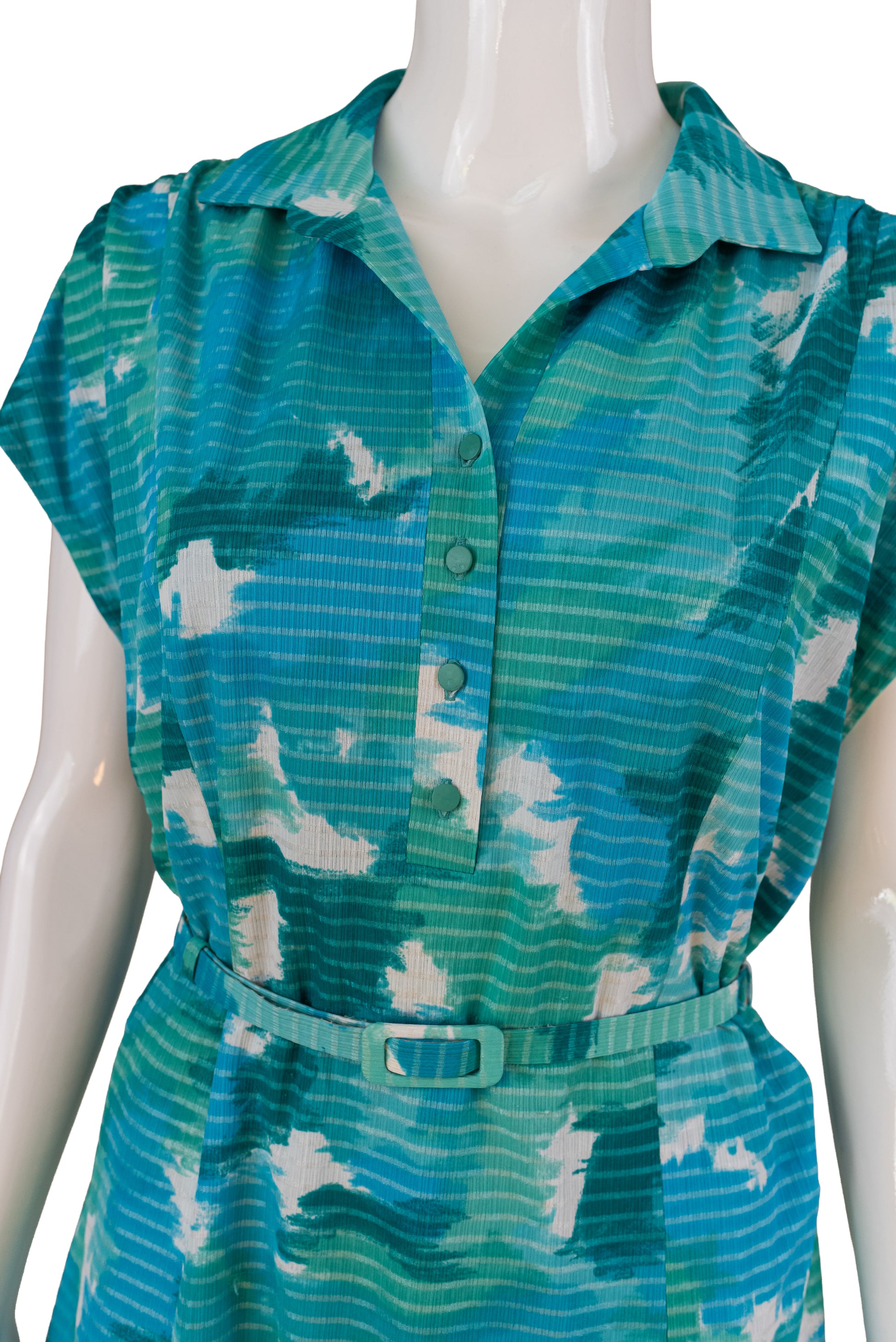 Vintage Elvi Couture 80s kjóll. Blár og sægrænn. Hnepptur að framan með belti. Engin teygja í efni. 70% acetate, 30% polyamide. Ástand gott. Stærð XL.