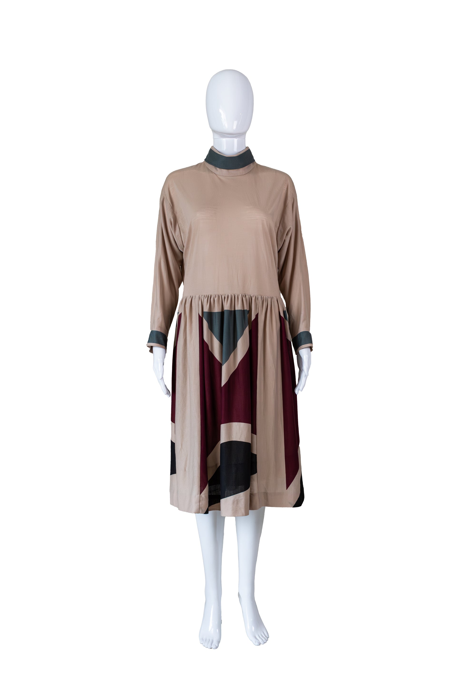 Vintage Eska kjóll með bláu og vínrauðu geometrísku munstri. Renndur að aftan. Engin teygja í efni. 100% polyester. Ástand gott. Merkt stærð 46. Mæld stærð M.