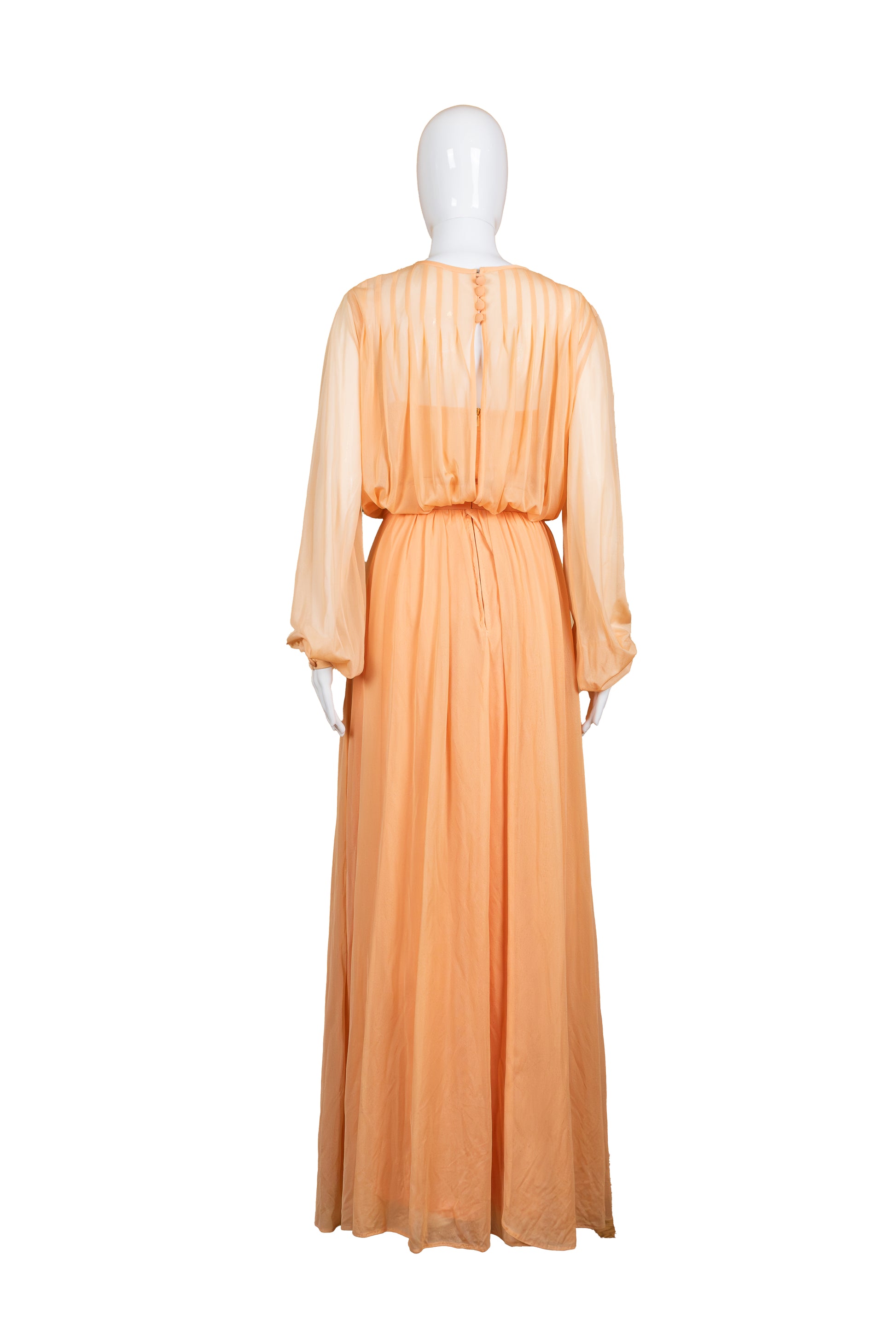 Laborn vintage 70s síðkjóll. Glæsilegur kjóll úr appelsínugulu chiffon efni, með undirkjól. Hnepptur í bakið og renndur að aftan. Lykkjur fyrir belti. Engin teygja í efni. 80% acetate og 20% polyester. Ástand mjög gott. . Áætluð stærð XL.