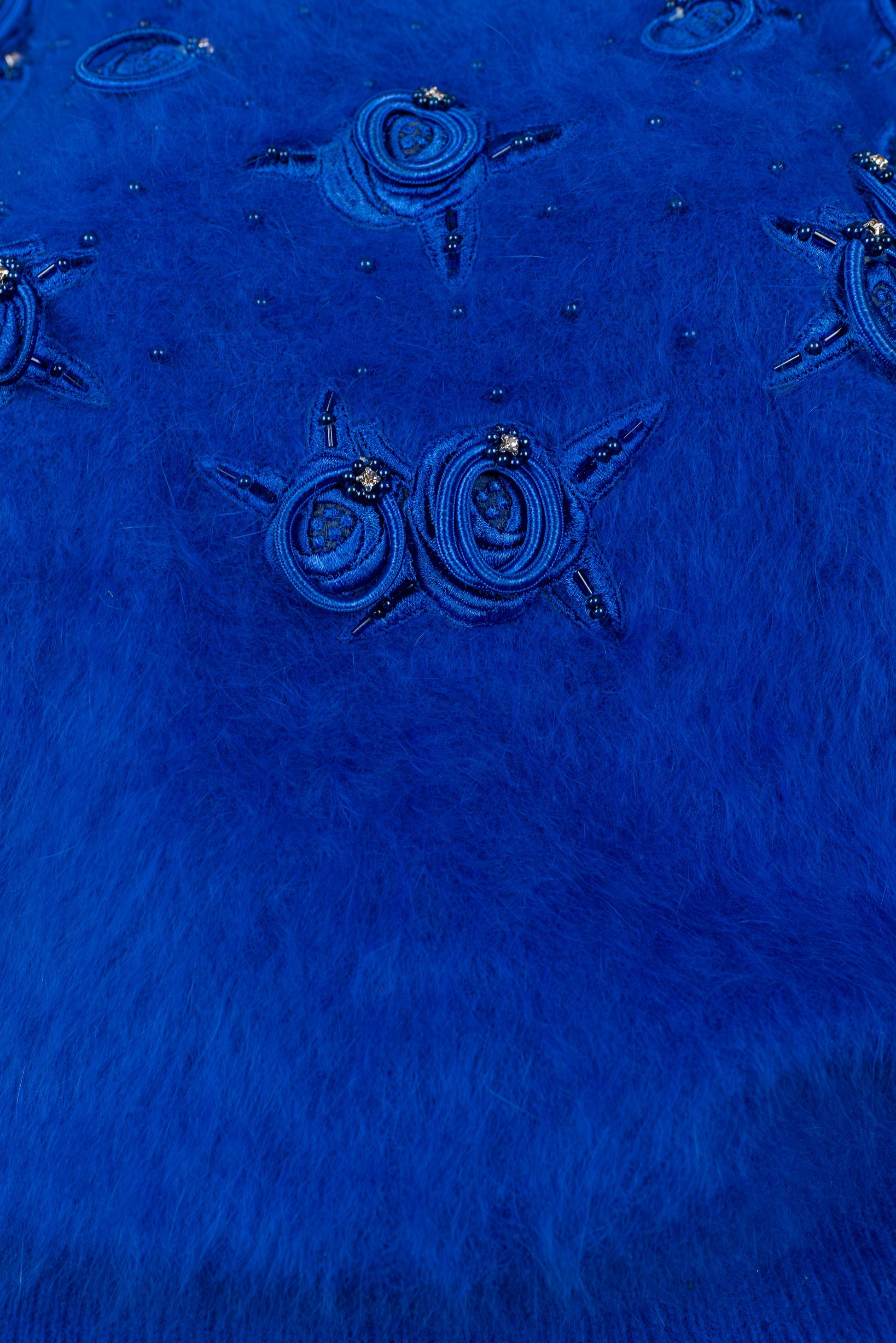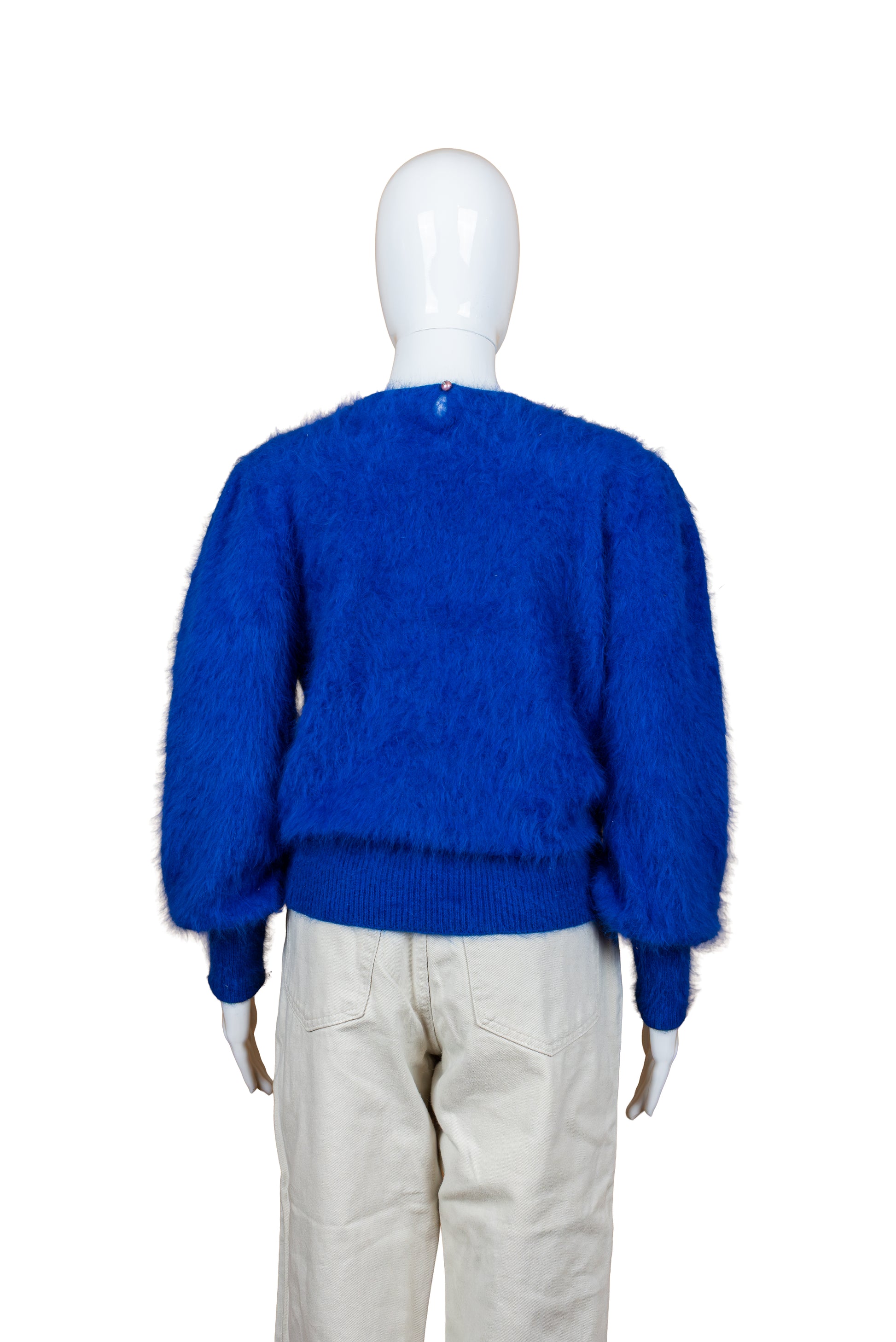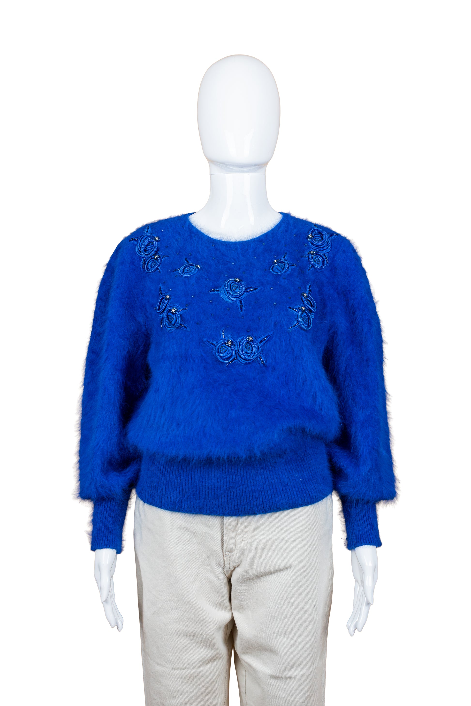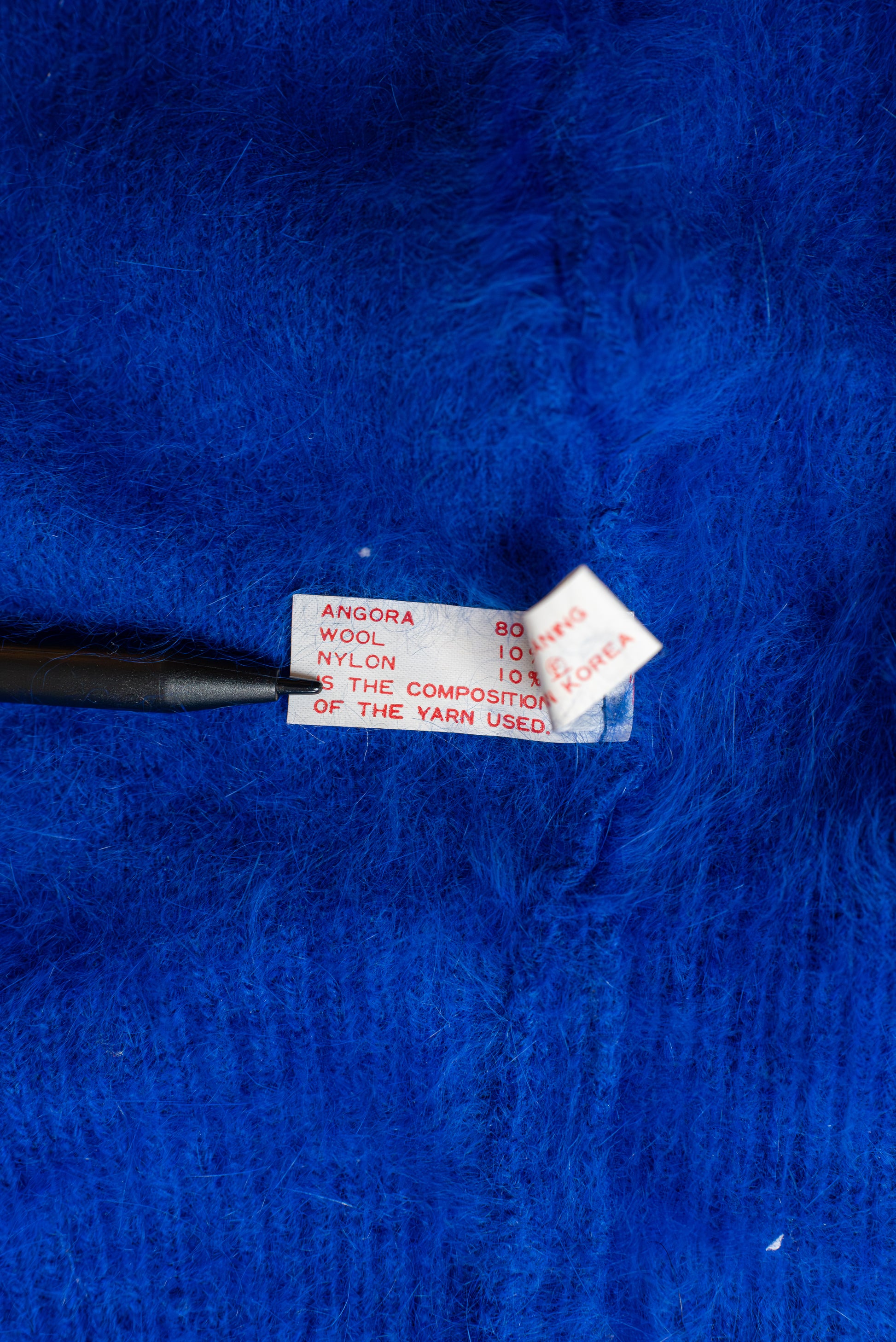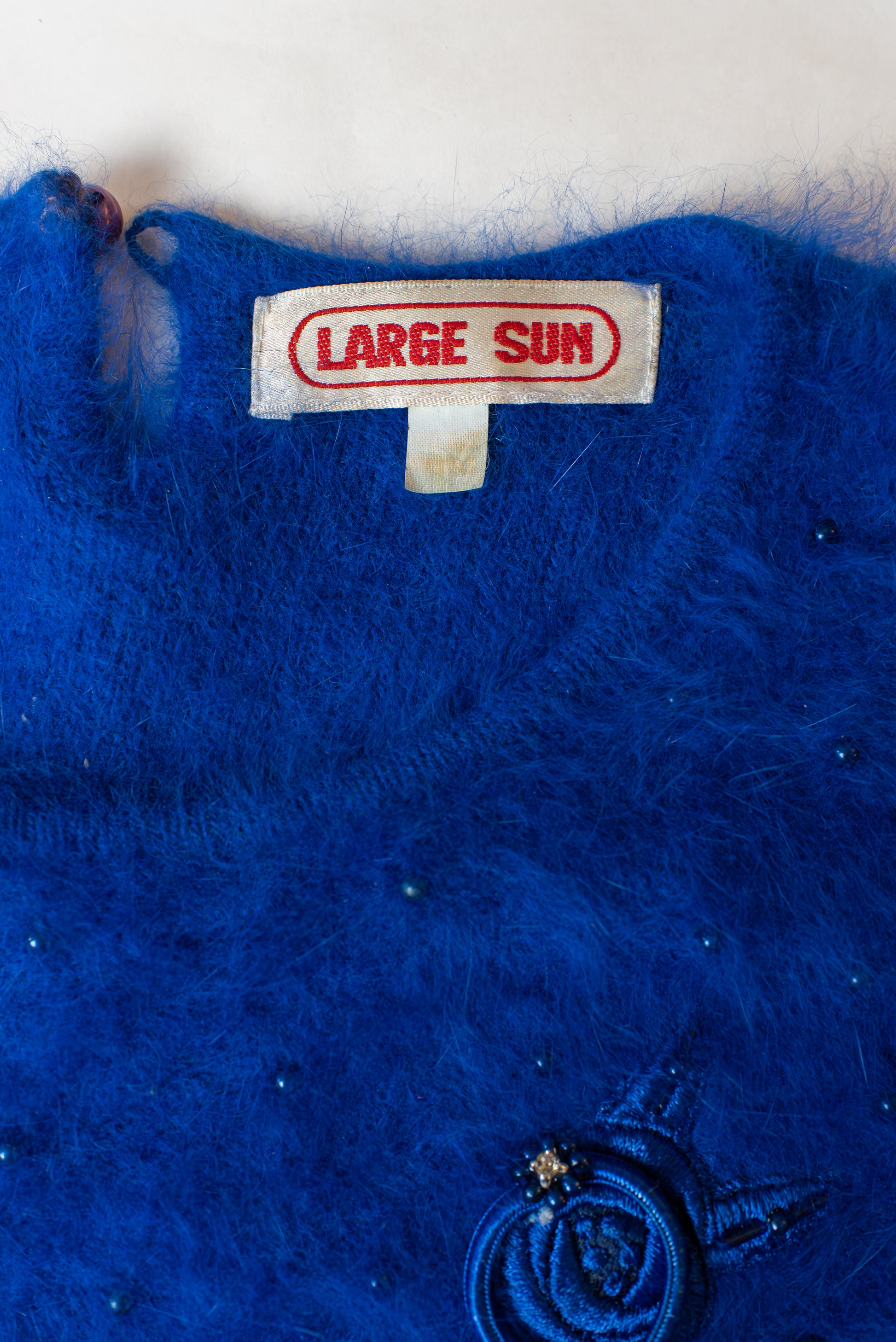 Large Sun vintage 80s prjónapeysa. Blá með perlumunstri. 80% angóra, 10% ull, 10% nylon. Ástand mjög gott. Mæld stærð M.