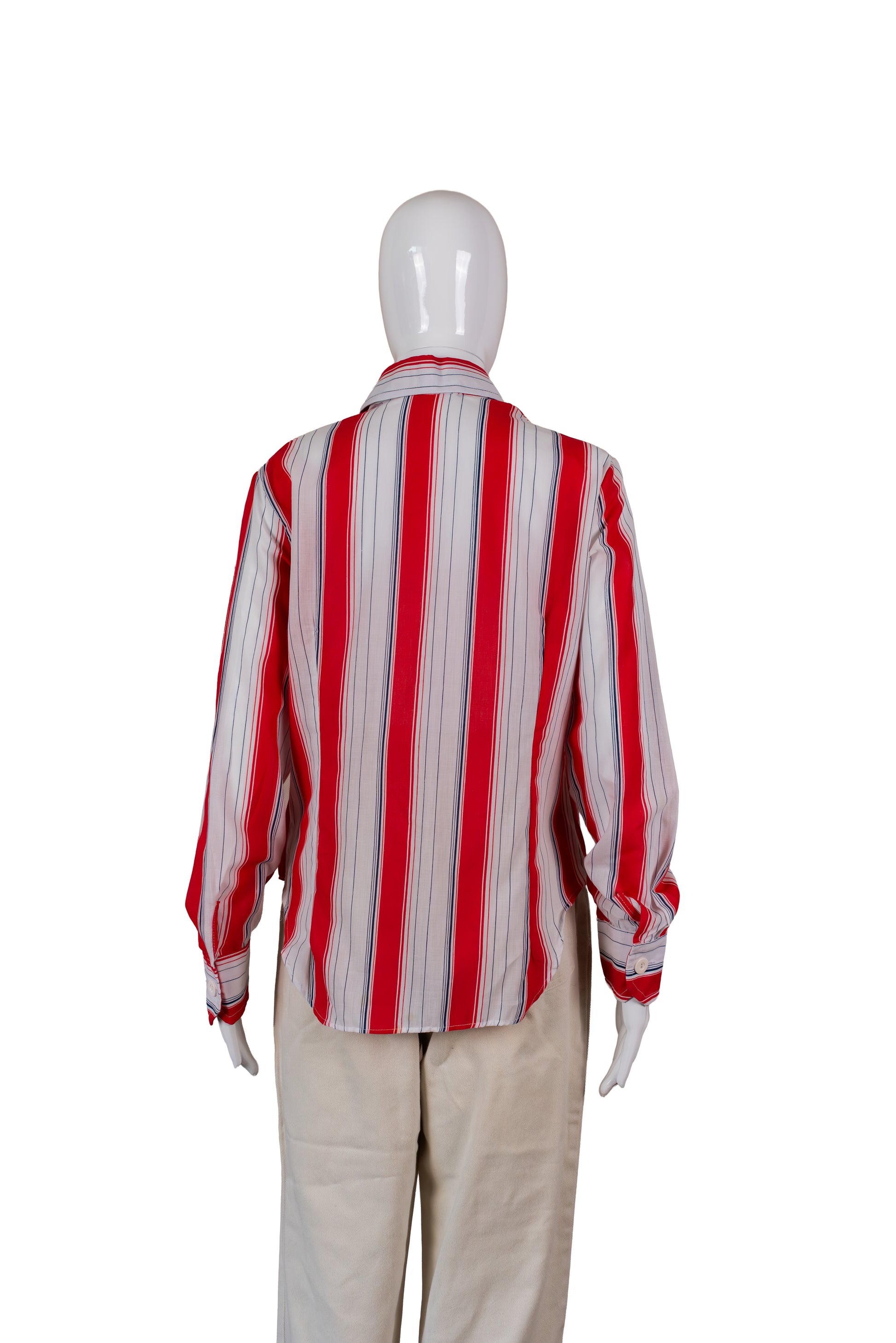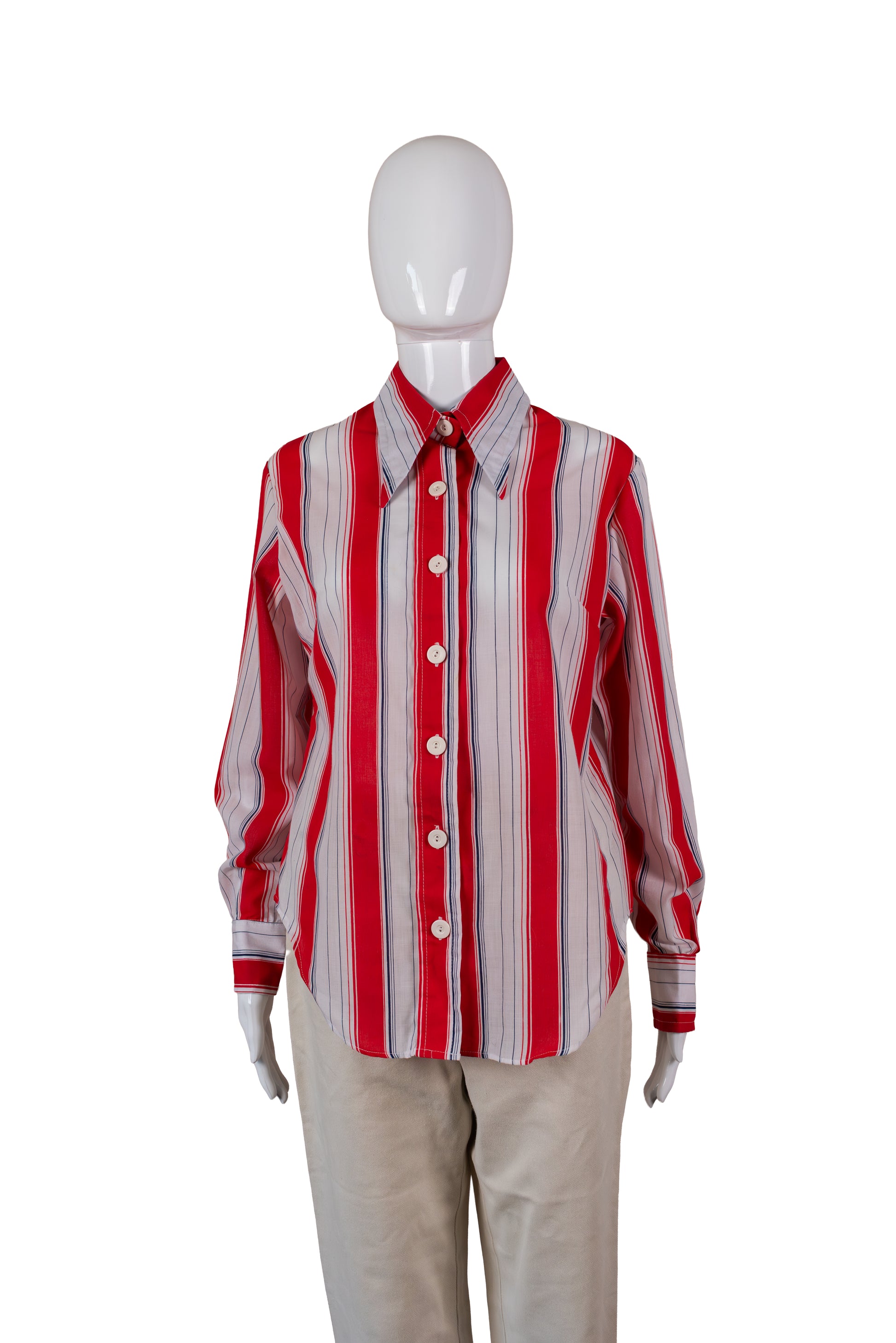 Lovely rauð röndótt vintage 70s skyrta. Hneppt. Aðsniðin. 65% polyester, 35% bómull. Merkt stærð 48. Mæld stærð M - L.