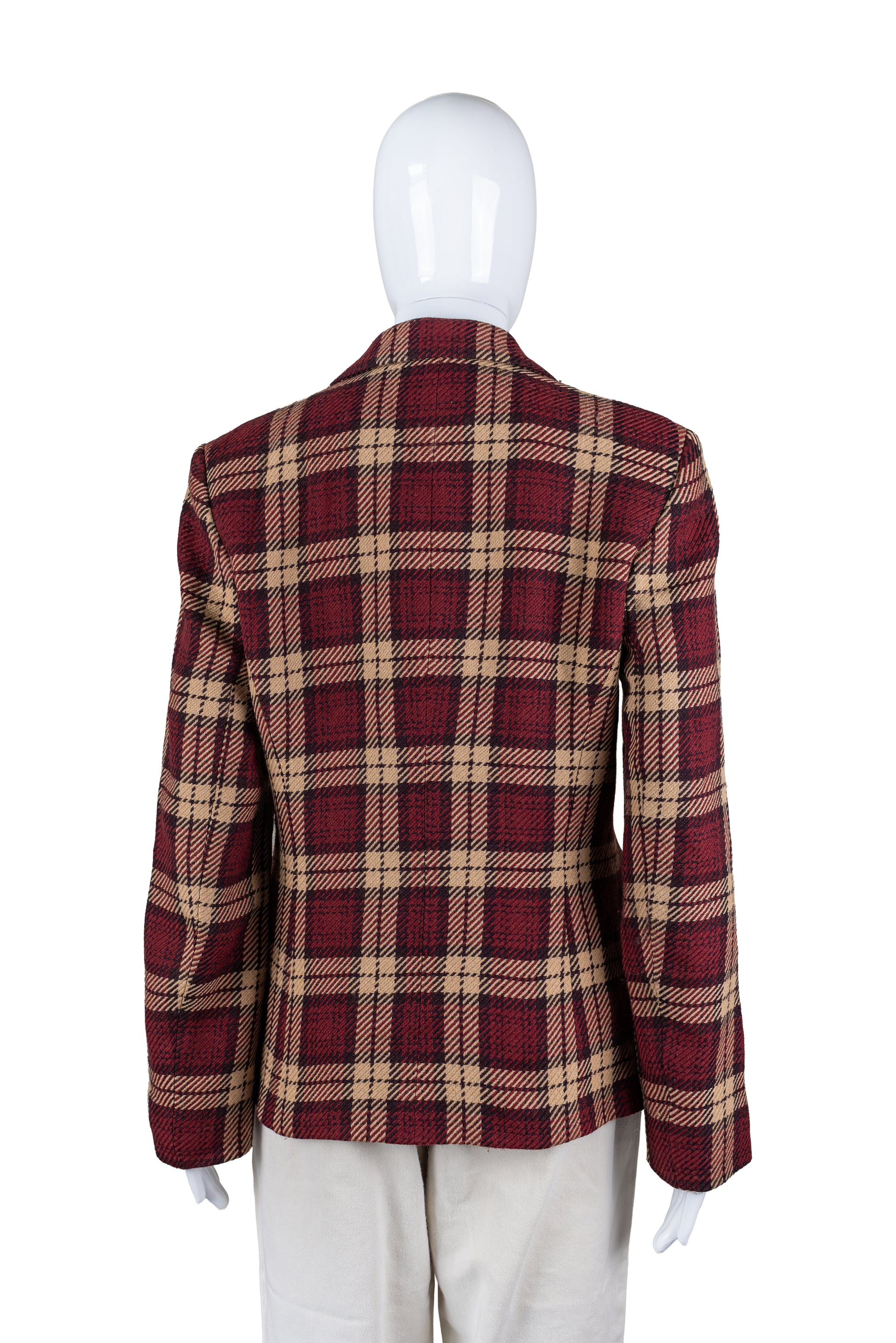 Marc Aurel vintage blazer. Aðsniðinn, rauðköflóttur með axlarpúðum. Líklegast úr ullarblöndu. Ástand gott. Merkt stærð 38. Mæld stærð S.