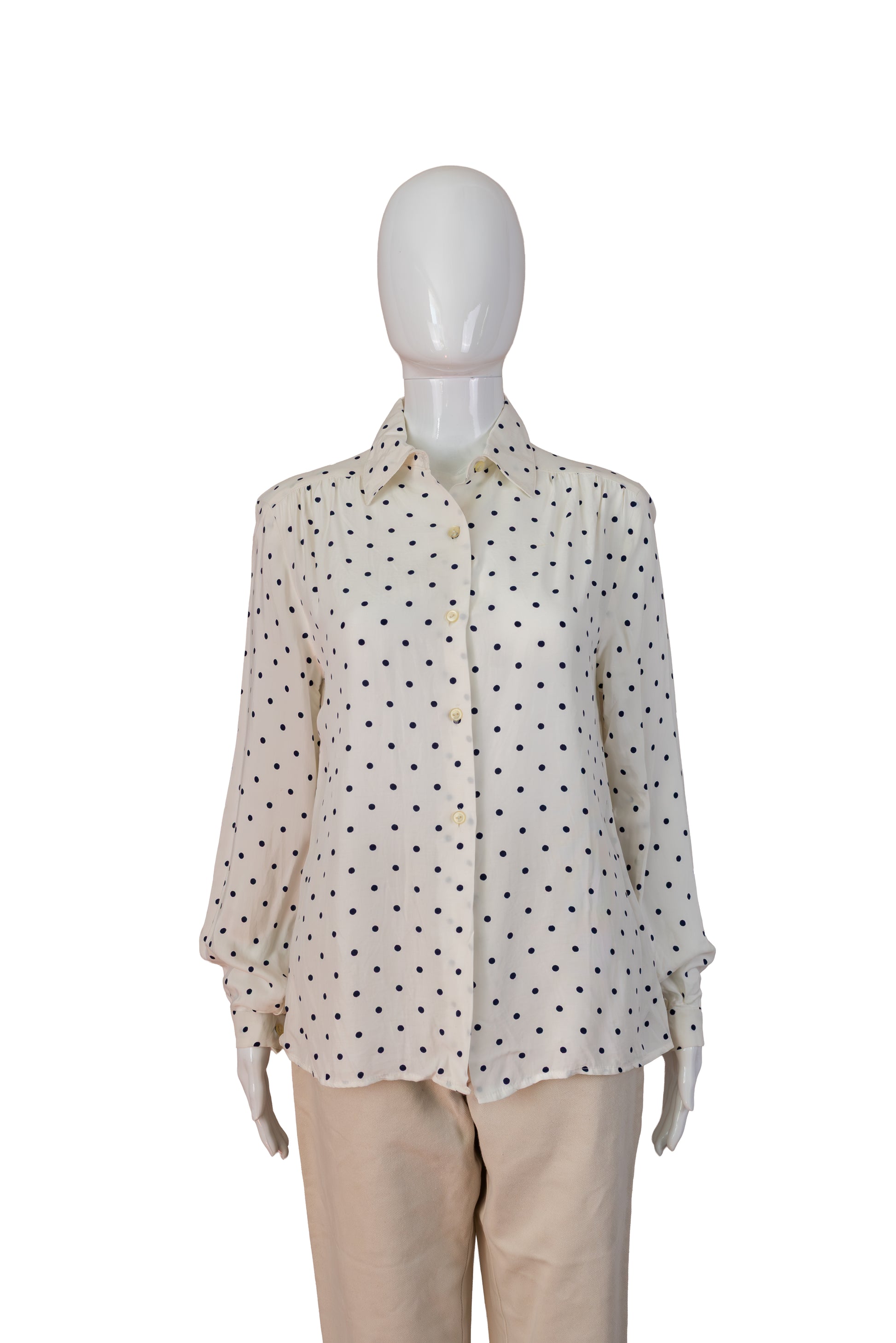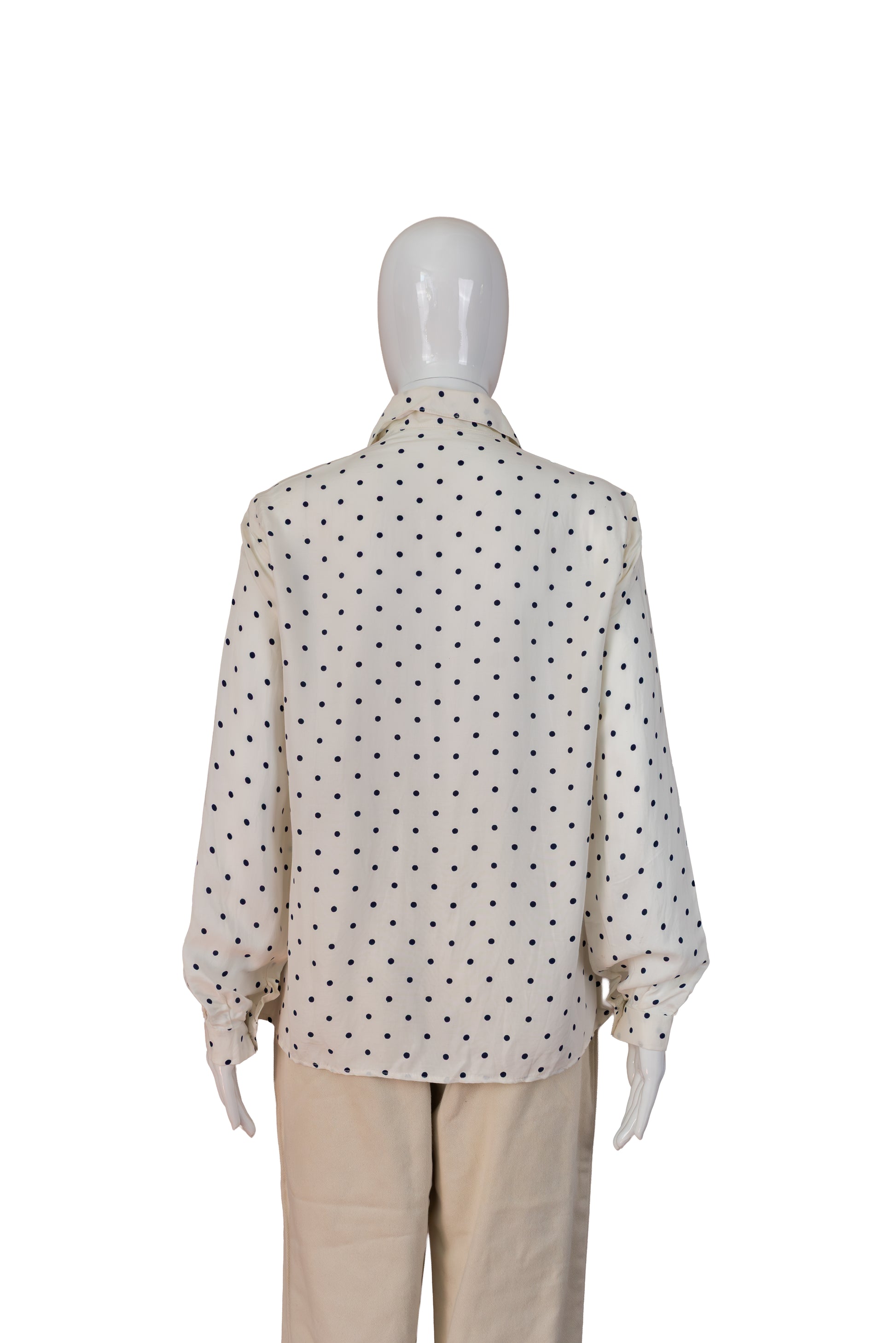 Ómerkt vintage doppótt skyrta. Hvít með svörtum doppum. Hneppt. Líklegast úr polyester. Áætluð stærð M.