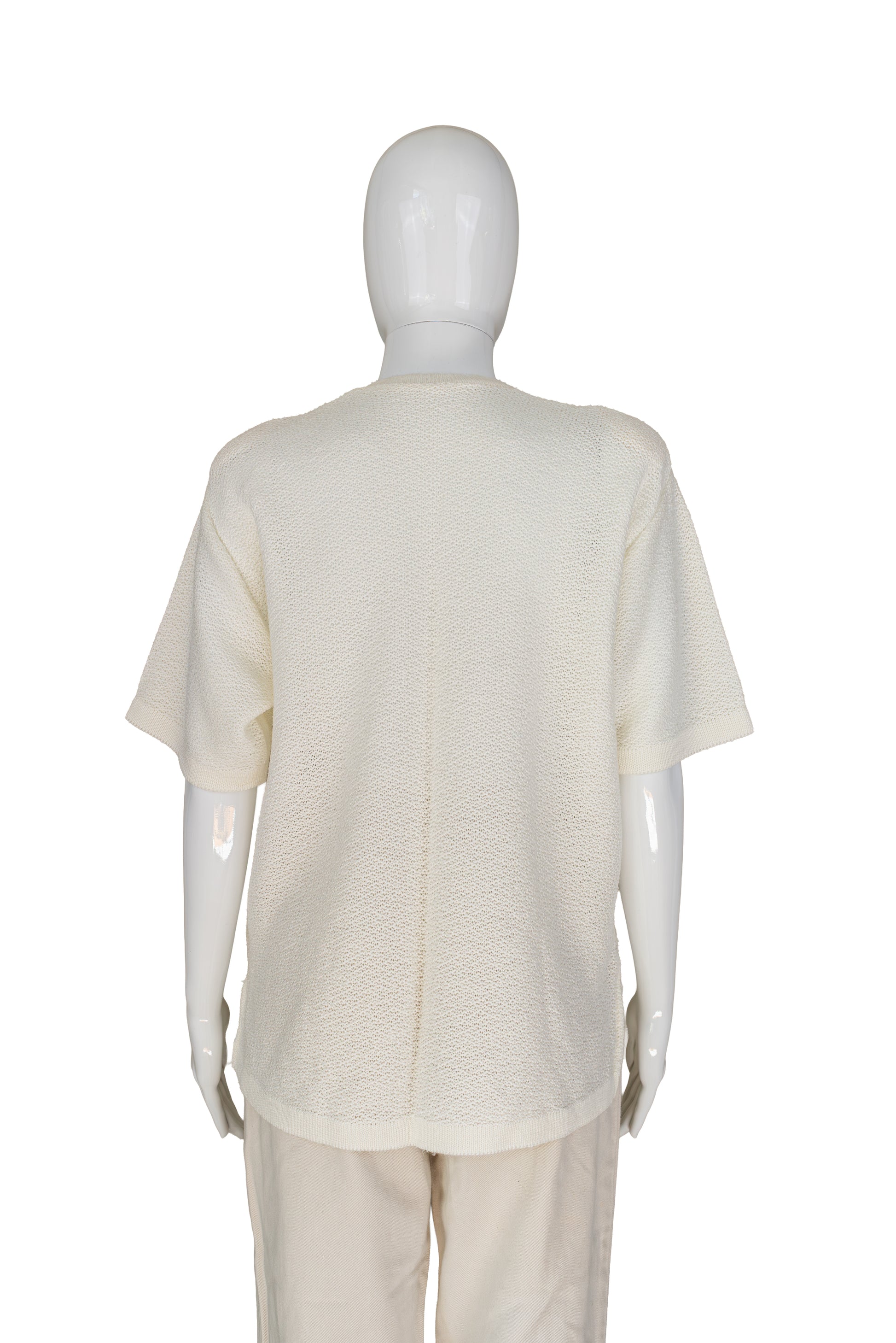 Ómerkt hvít vintage prjónapeysa. Stutterma og með axlarpúðum. Líklegast úr akrýl og bómull. Peysan er eins og ónotuð, líklegast new old stock. Mæld stærð XL.