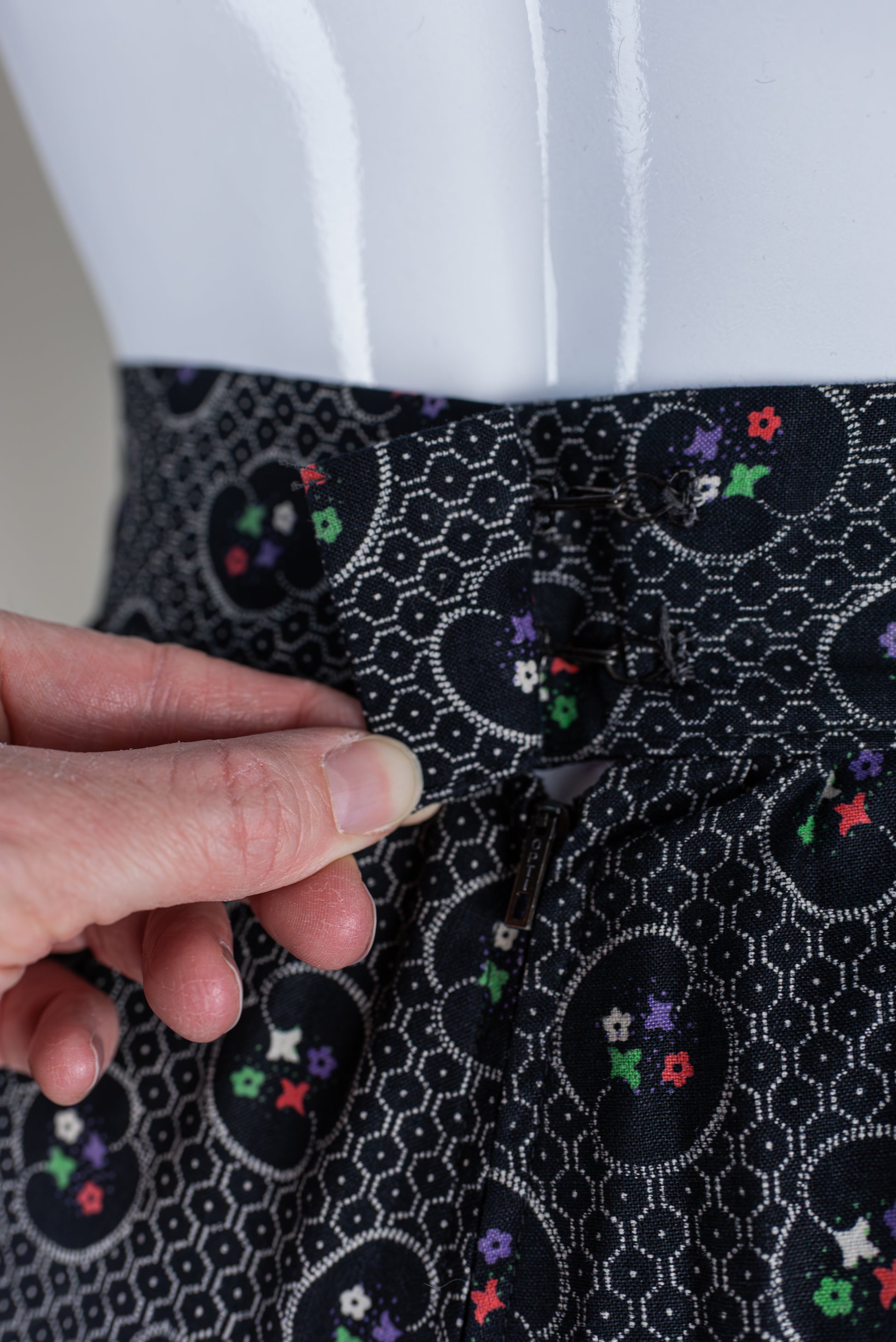 Ómerkt vintage 70s síðpils. Svart með doppóttu munstri. Líklegast úr bómull. Engin teyja í efni. Væri hægt að færa til krækjur og víkka strenginn um nokkra cm. Ástand gott. Mæld stærð XS.