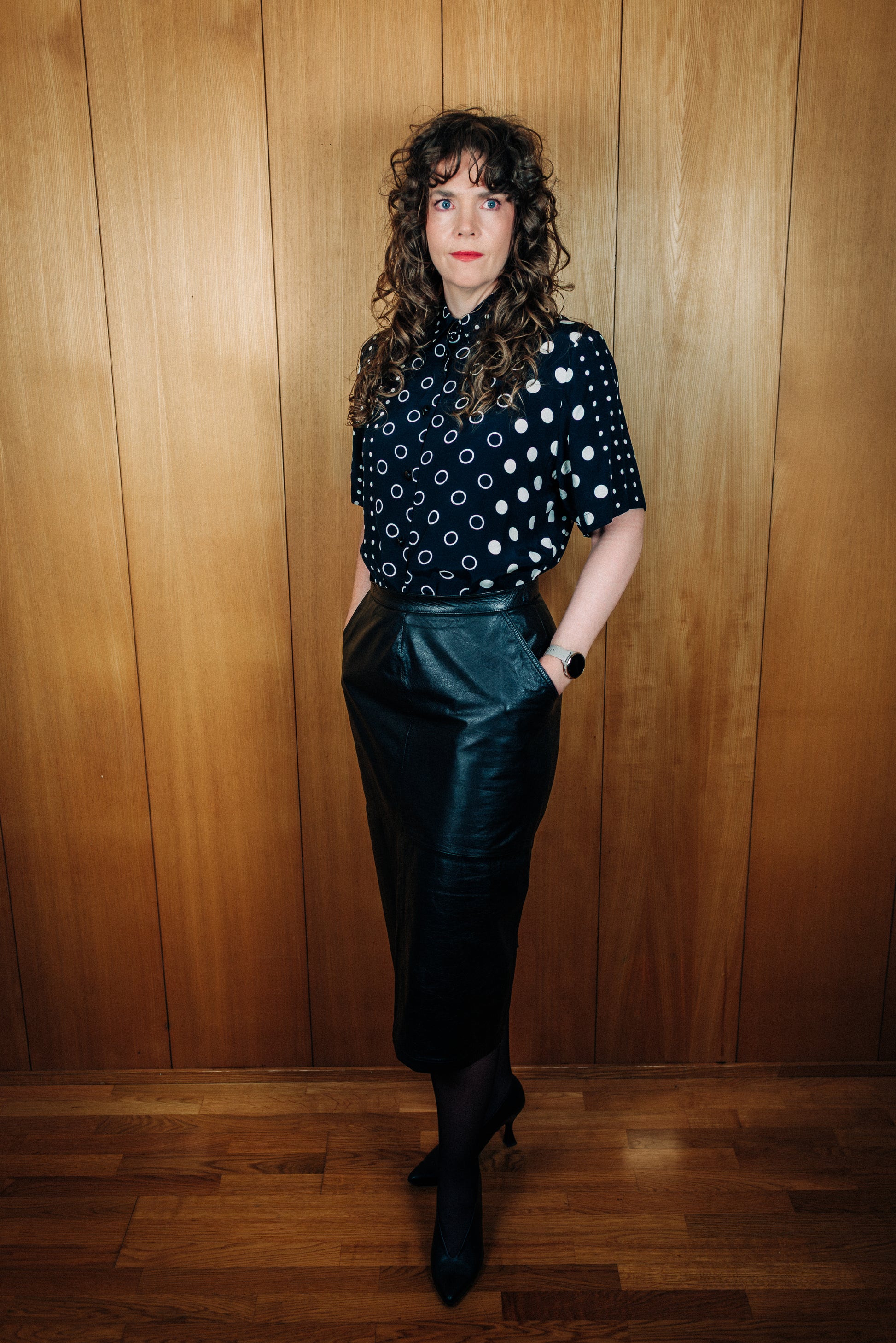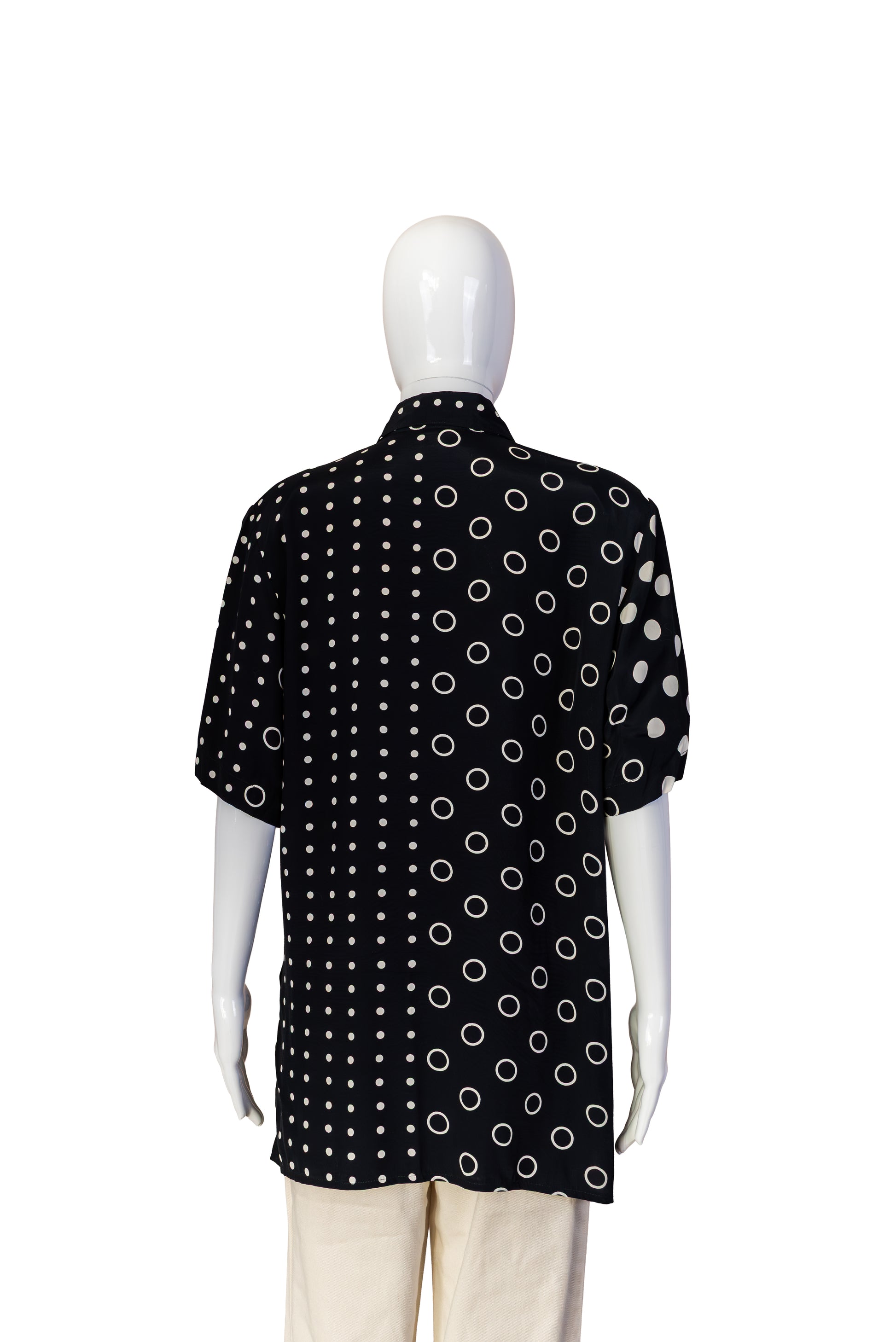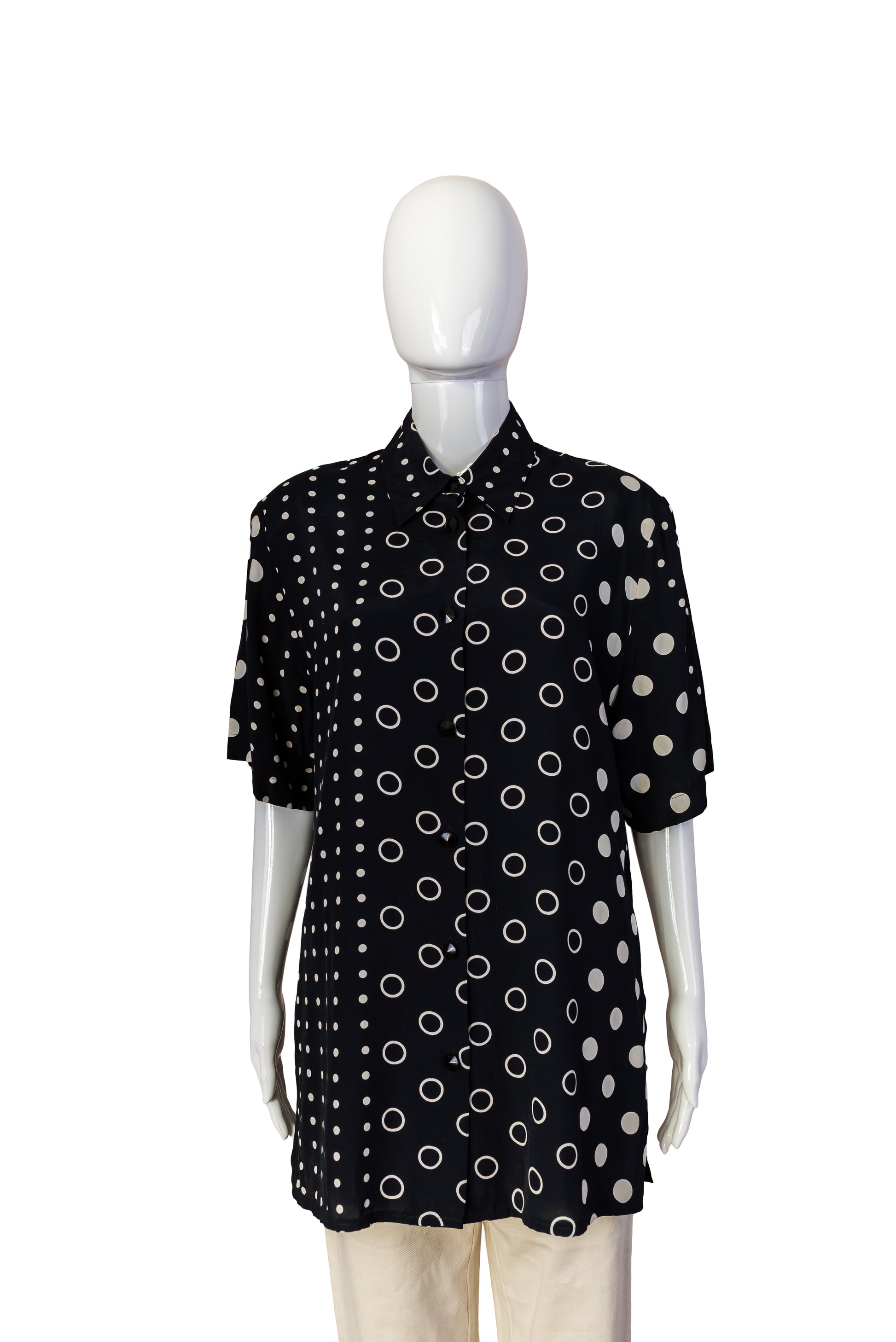 Ómerkt vintage skyrta. Svört með off white doppum og axlarpúðum. Hneppt. Líklegast úr polyester. Áætluð stærð M - L.