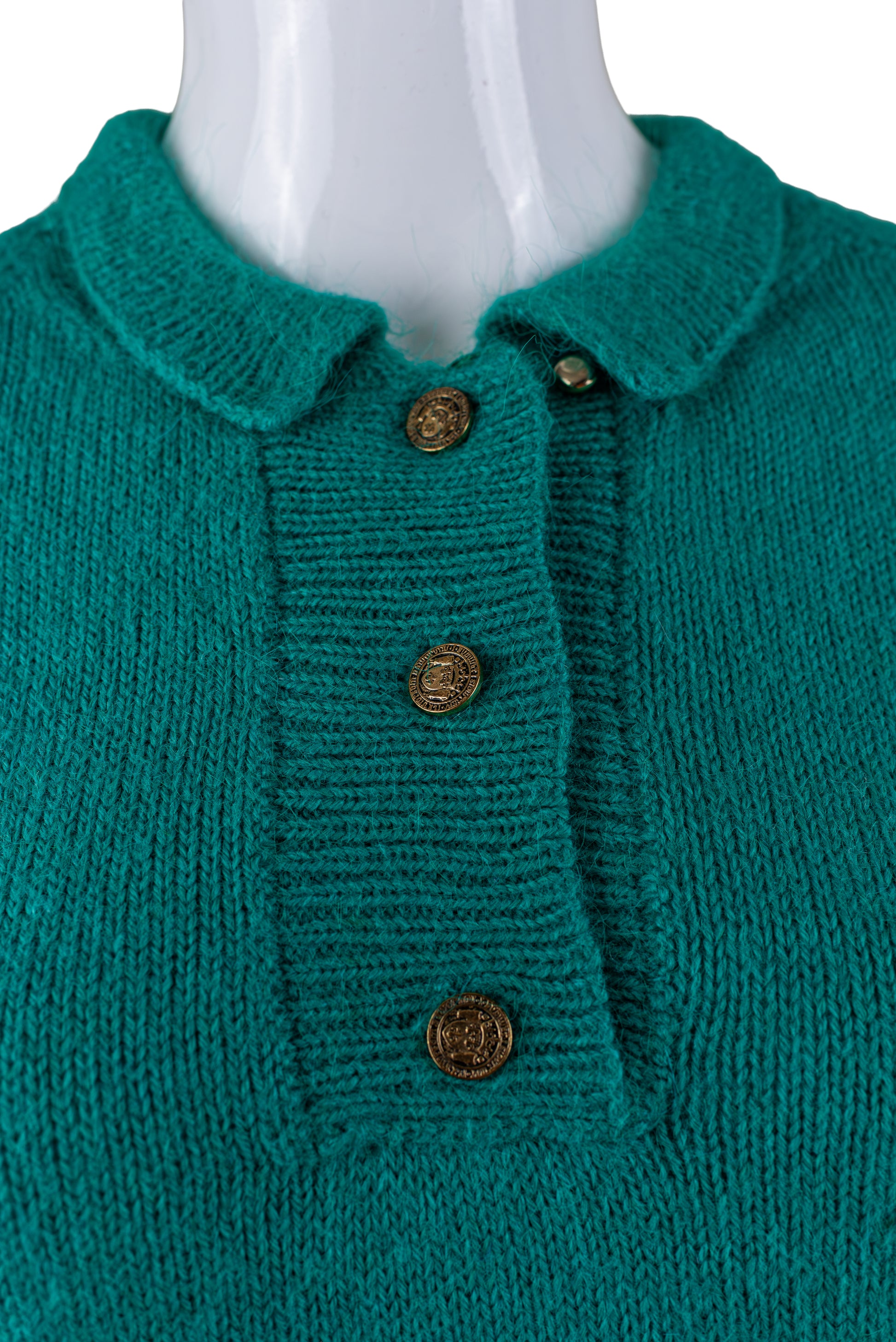 Ómerkt vintage prjónapeysa. Grænblá með gylltum hnöppum. Ástand gott. Mæld stærð M.