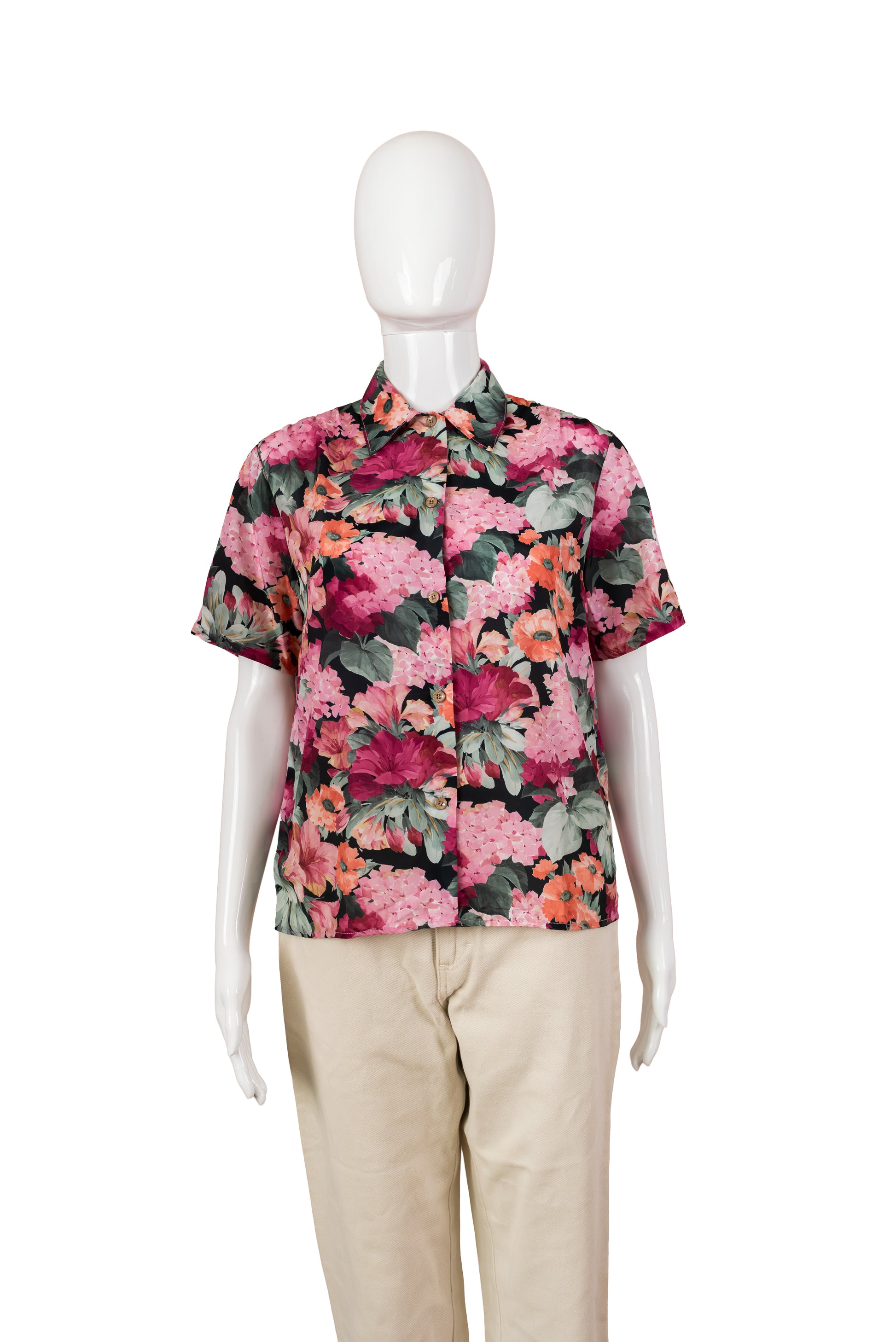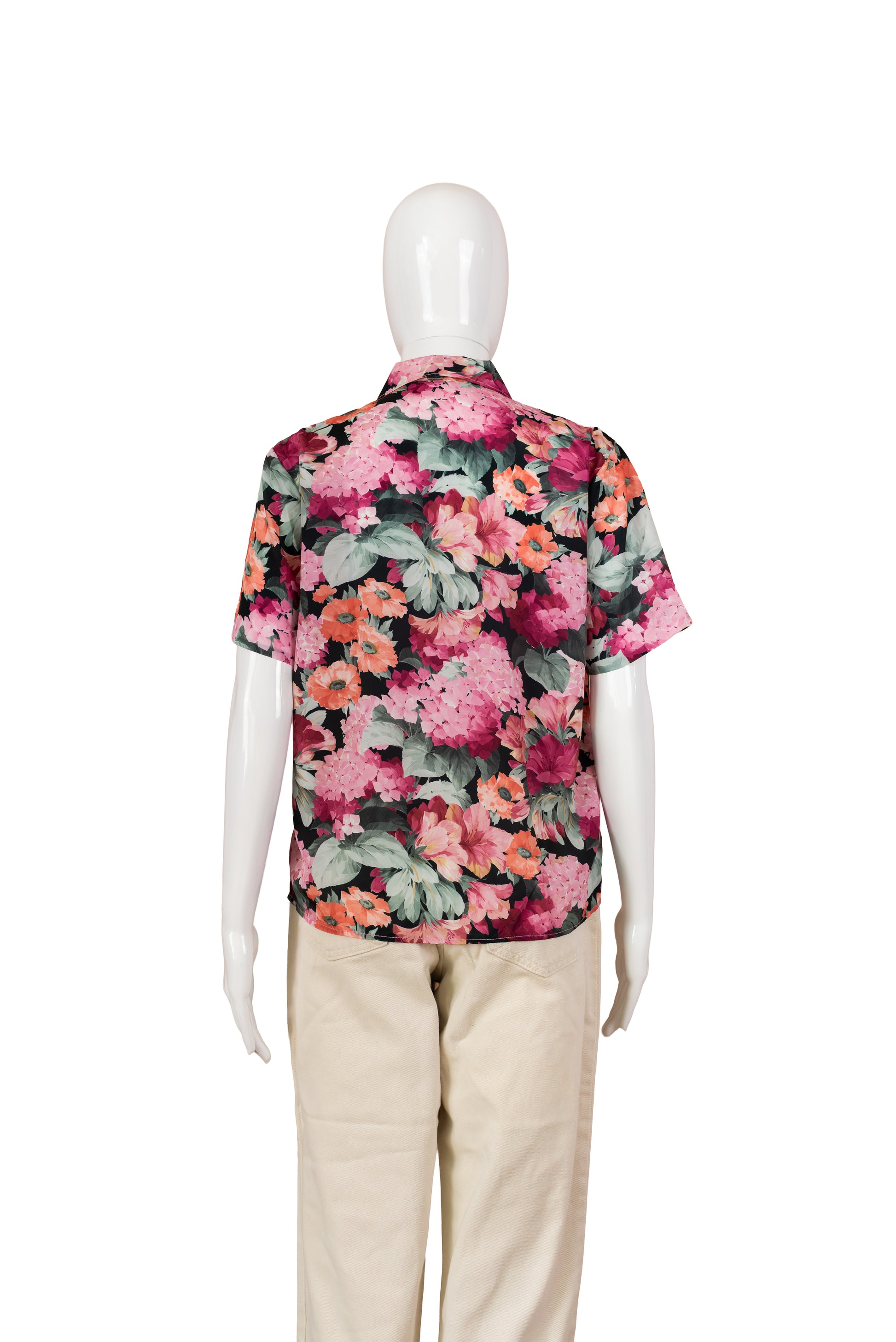 Ómerkt vintage skyrta með bleiku blómamunstri. Stutterma. Hneppt. Líklegast úr polyester. Mæld stærð S.