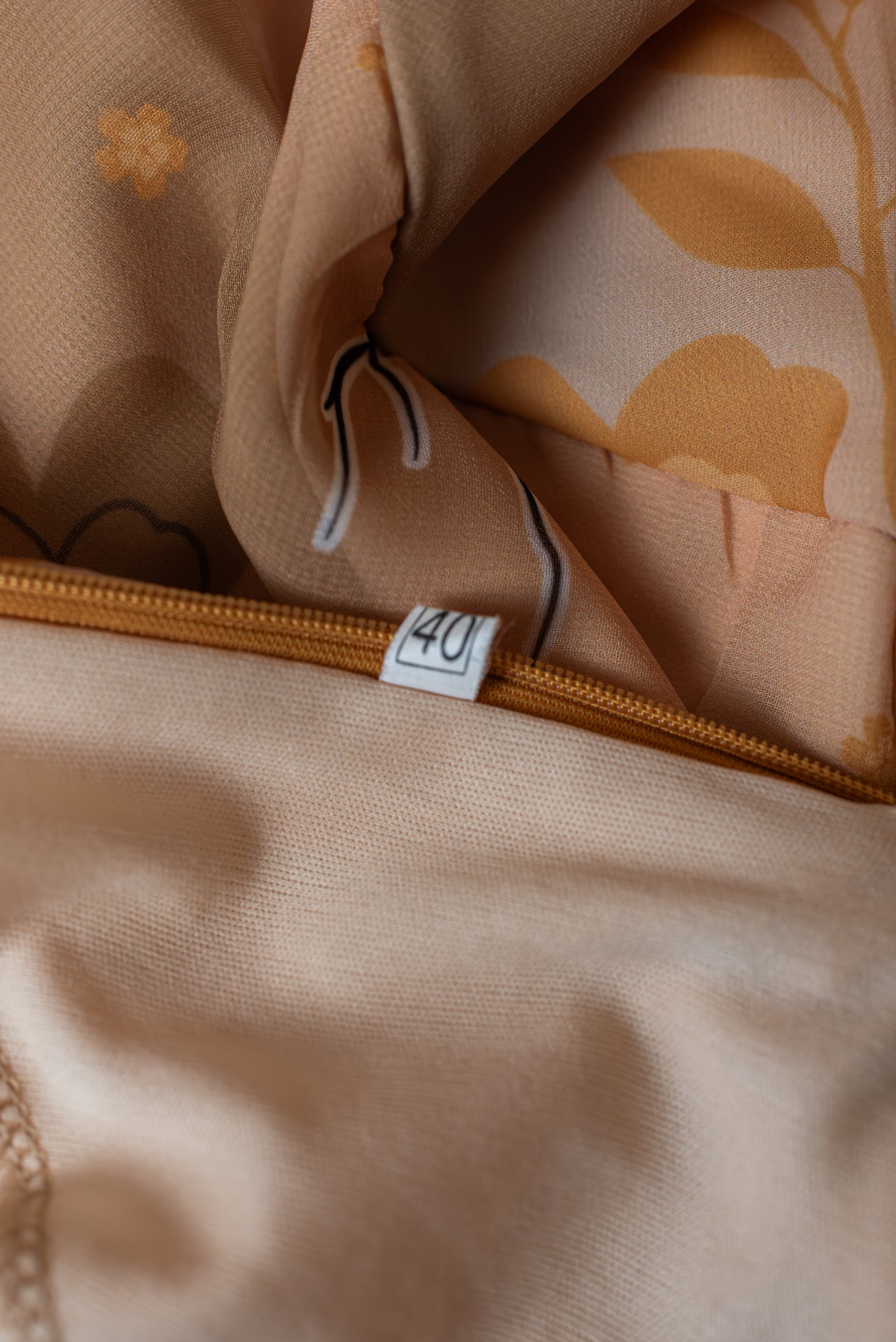 Ómerktur vintage 70s síðkjóll. Ljósbrúnn/appelsínugulur með appelsíngulum og brúnum blómum. Renndur að aftan. Athugið að ermarnar eru frekar þröngar. Líklegast úr polyester. Ástand gott. Merkt stærð 40. Áætluð stærð M.