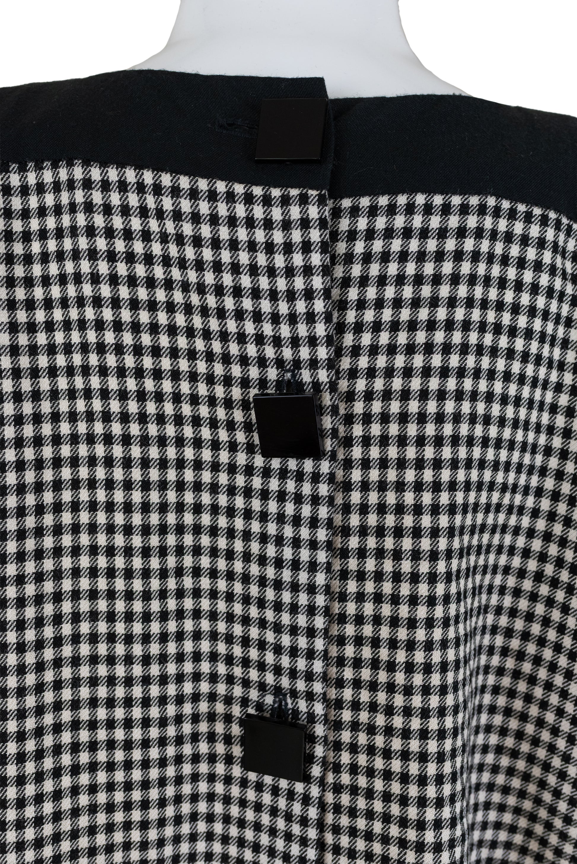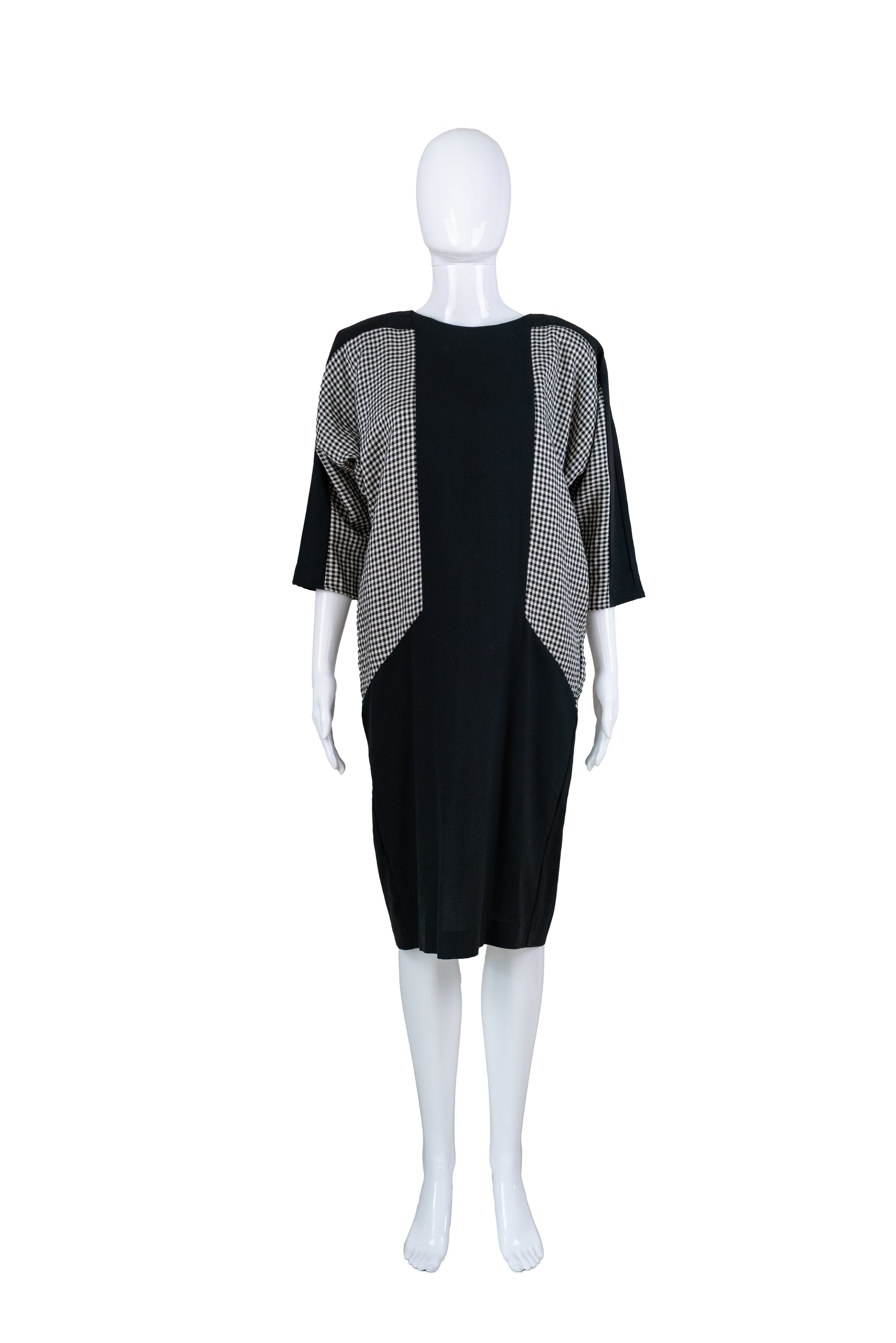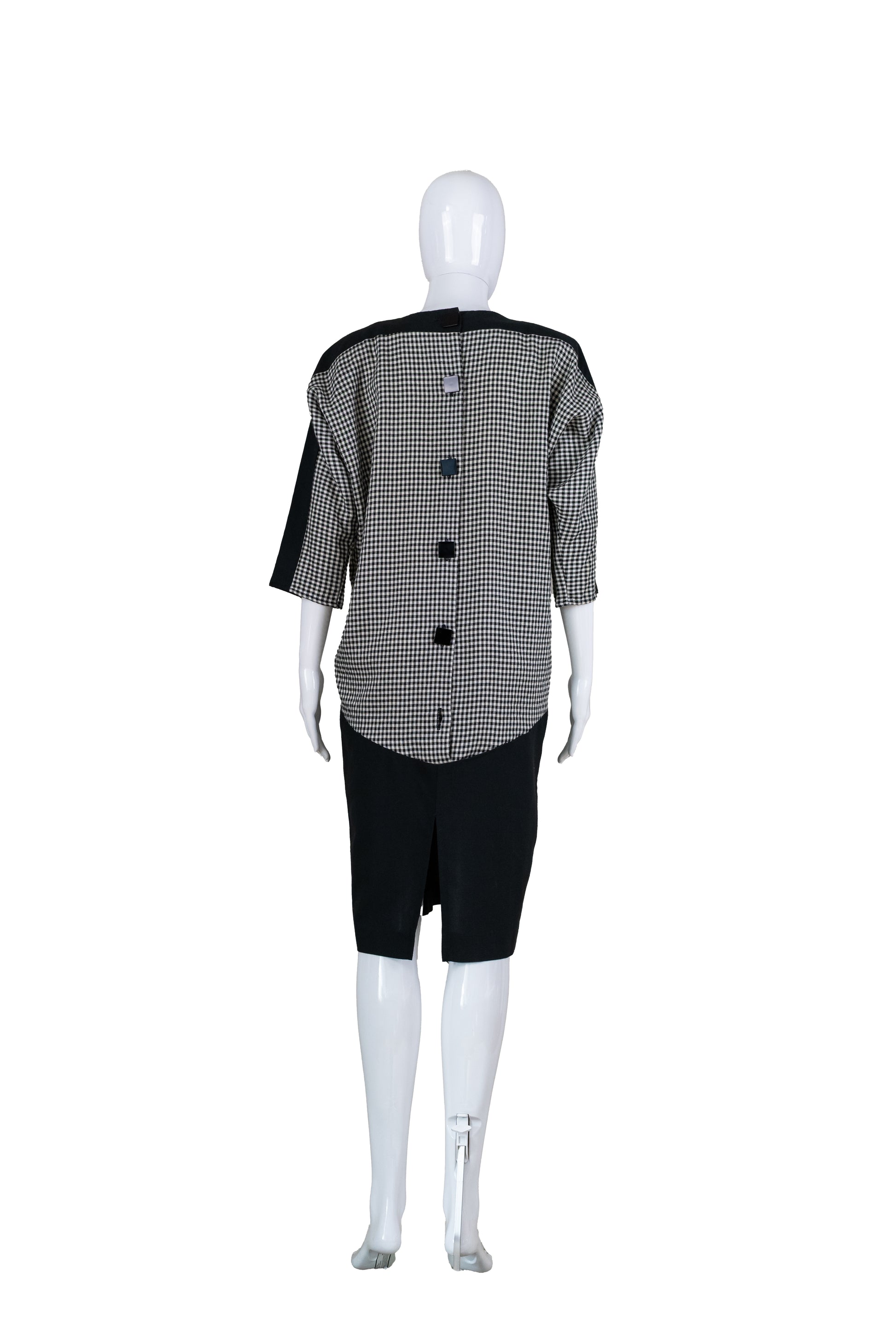 Vintage Parché 80s kjóll. Svarthvítur með köflóttu munstri. Hnepptur að aftann. Vantar neðstu töluna. Engin teygja í efni. 50% rayon, 50% polyester. Ástand gott. Stærð S.
