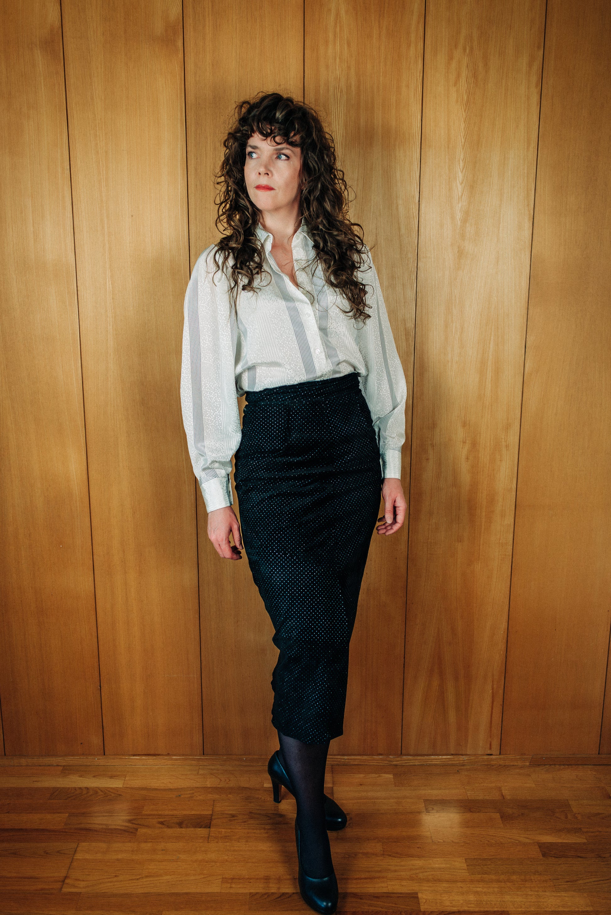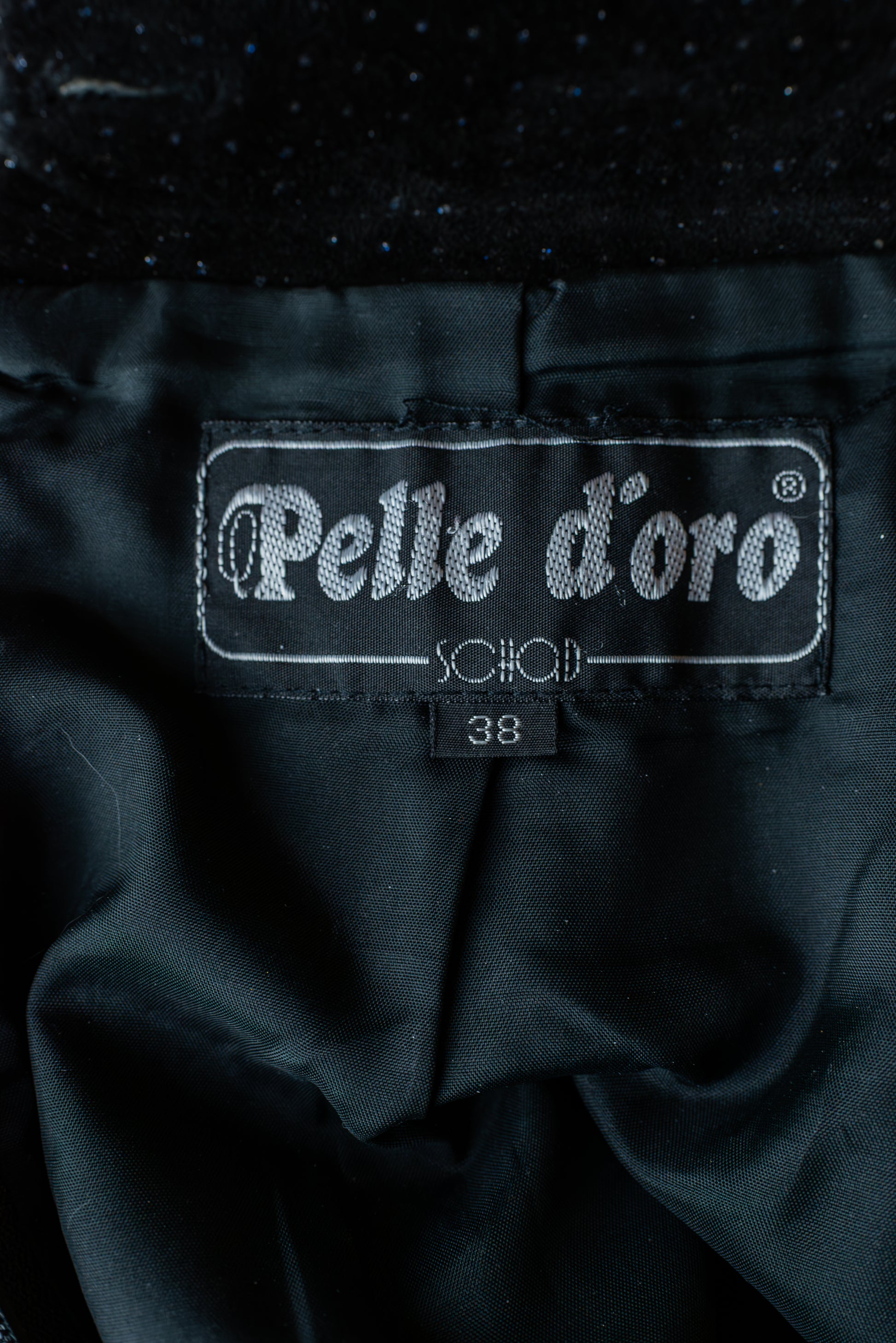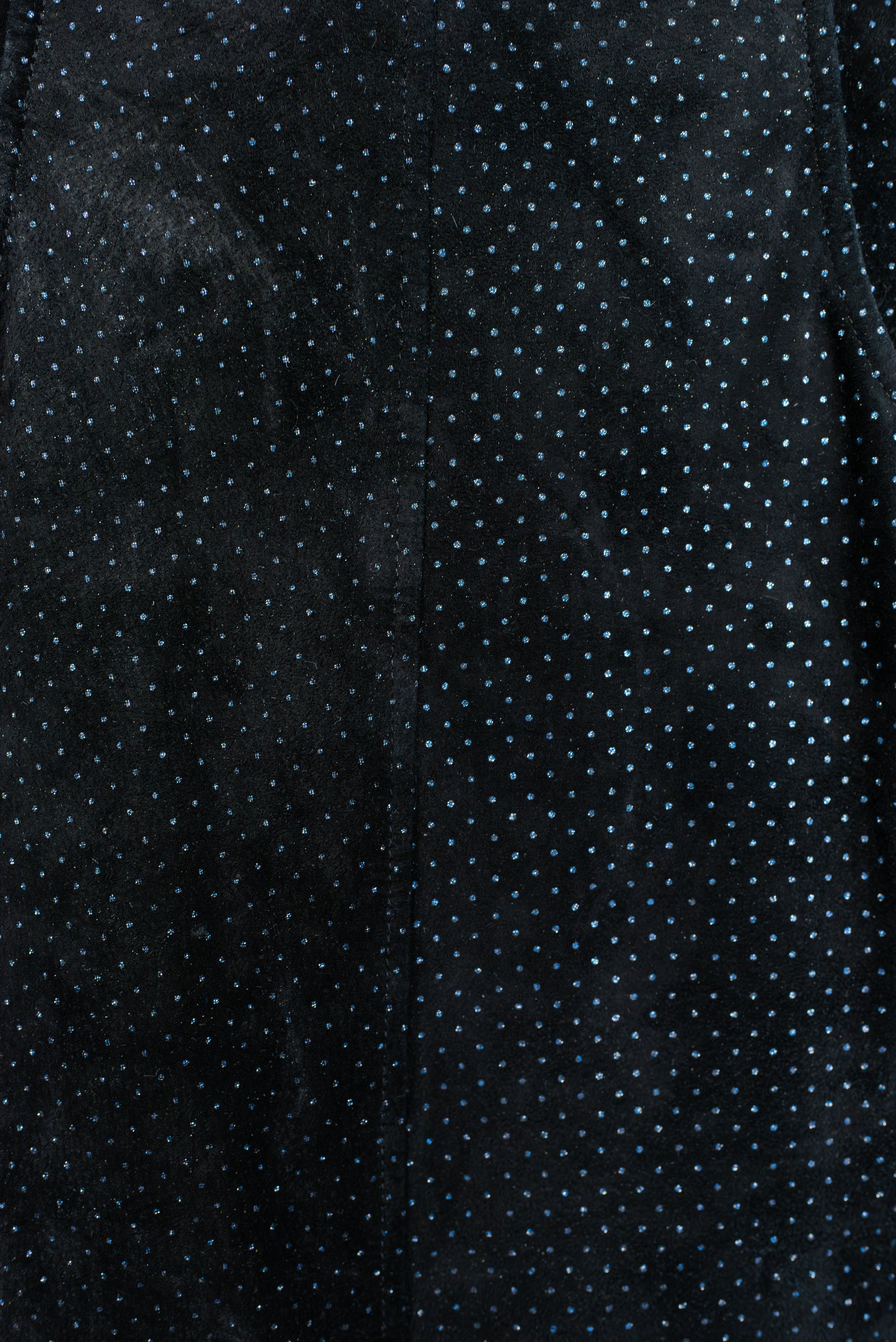Pelle D'oro vintage rúskinnspils. Svart með silfur og bláu glimmer. Hátt í mittið. Sítt pencil snið, með klauf að framan og aftan. Með vösum. Hneppt og rennt að aftan. Alvöru leður. Engin teyja í efni. Ástand mjög gott. Merkt stærð 38. Áætluð stærð small.