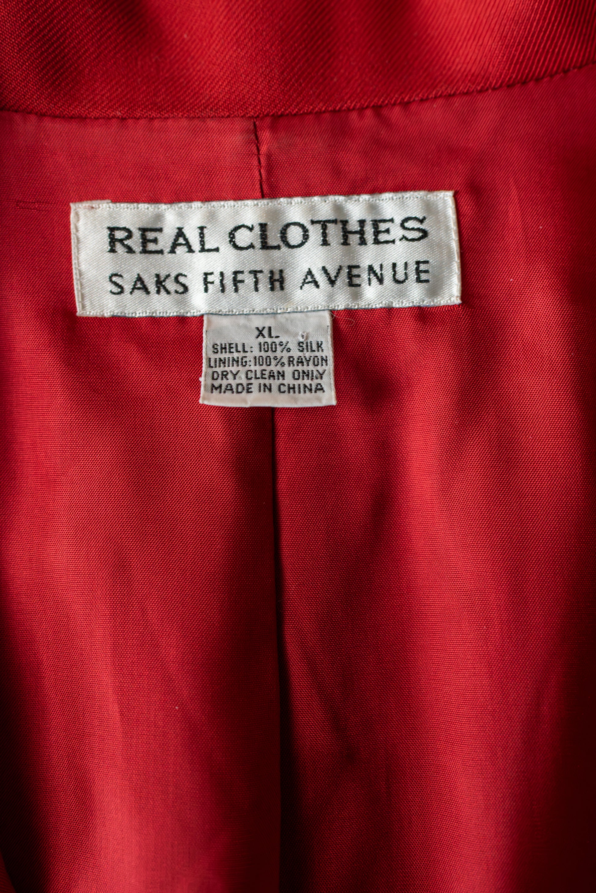 Real Clothes Saks Fifth Avenue vintage blazer. Rauður með axlarpúðum. 100% silki. Ástand mjög gott. Merkt stærð XL. Mæld stærð XL.