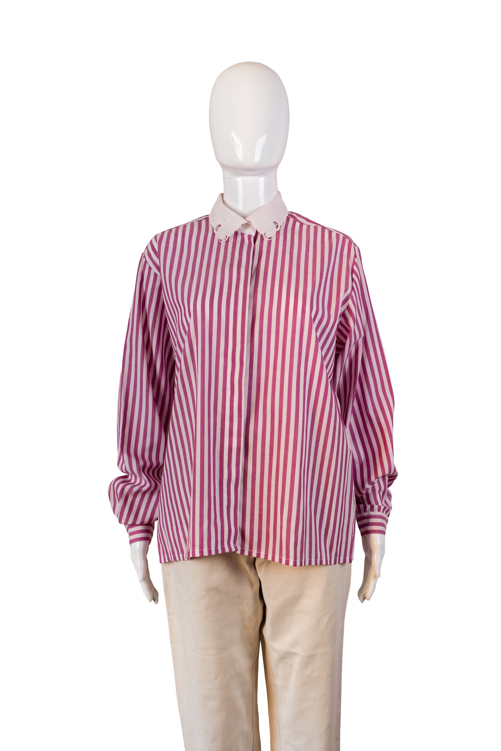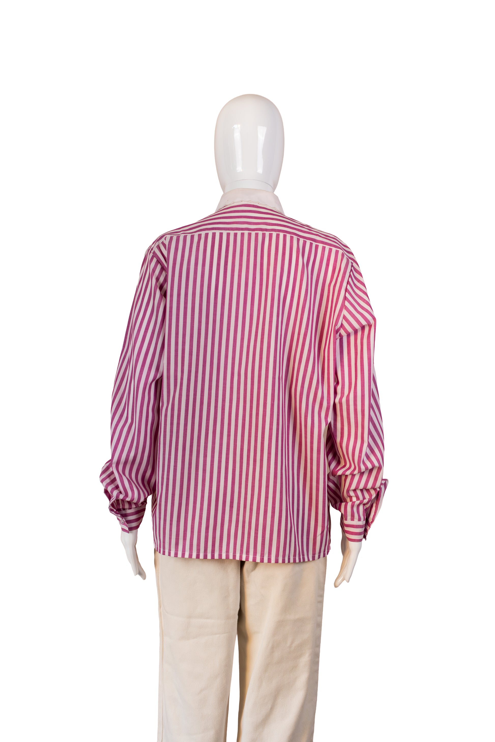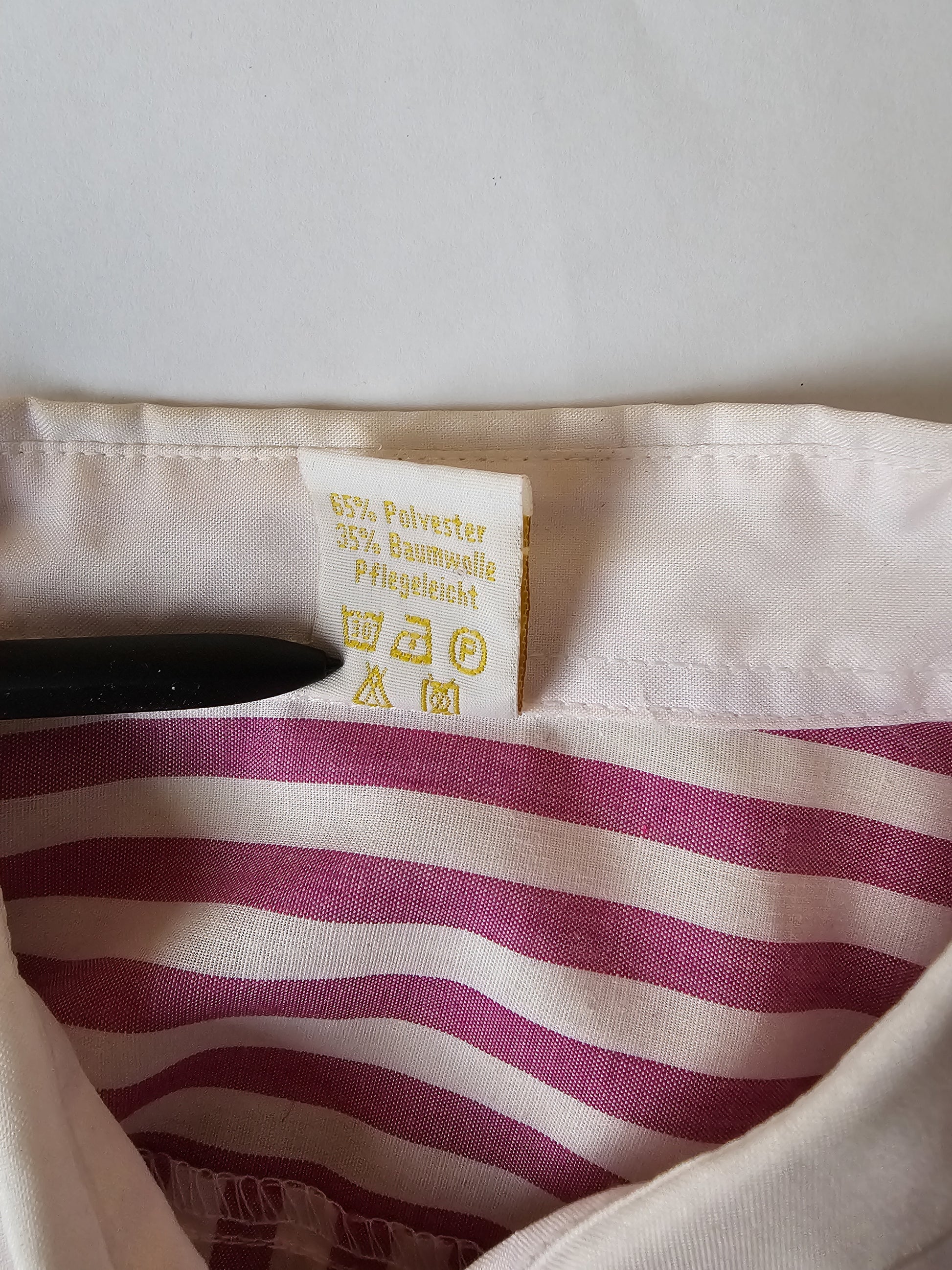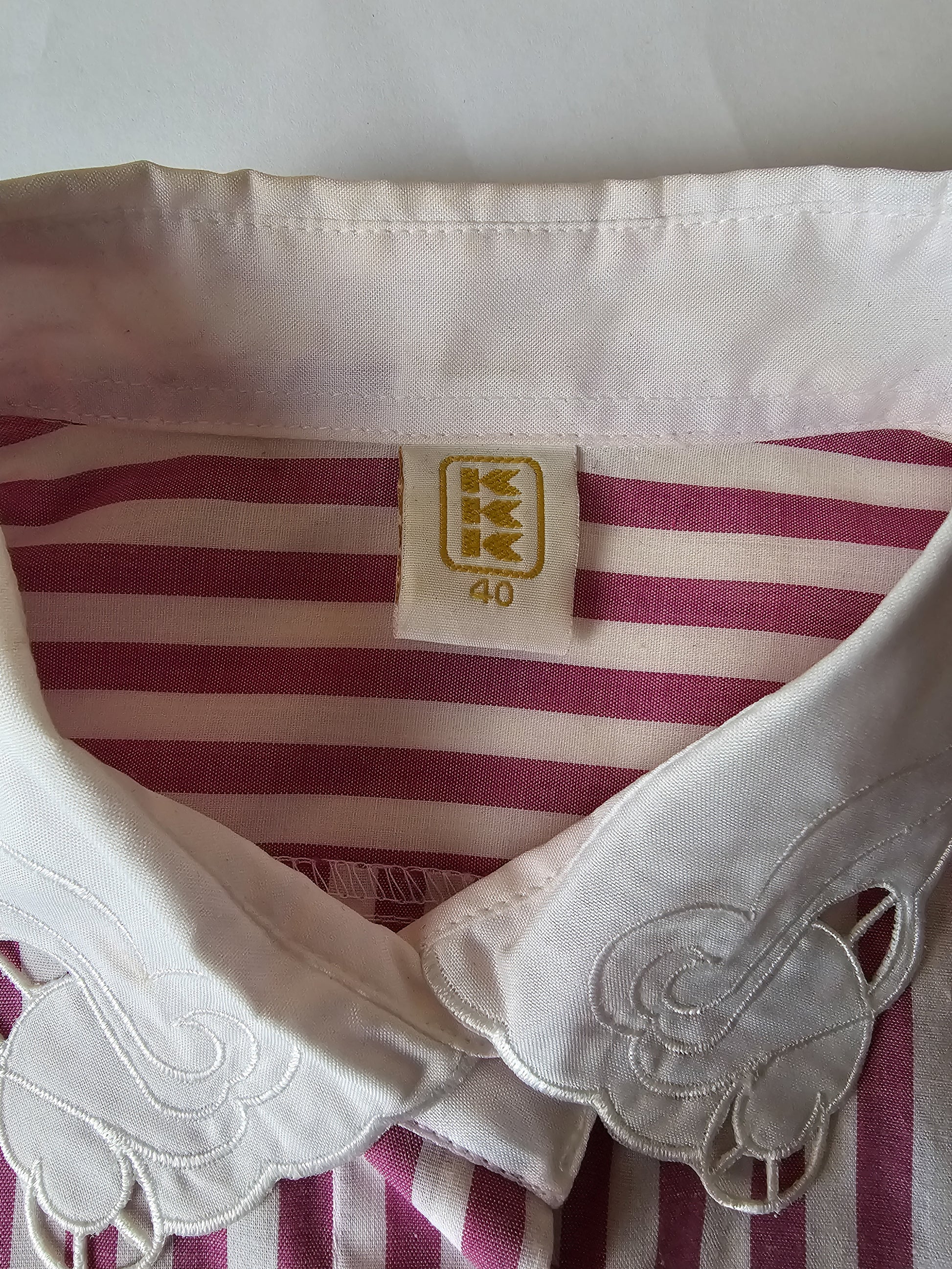 Röndótt, bleik vintage skyrta með hvítum kraga. Hneppt. 65% polyester, 35% bómull. Merkt stærð 40. Mæld stærð L.
