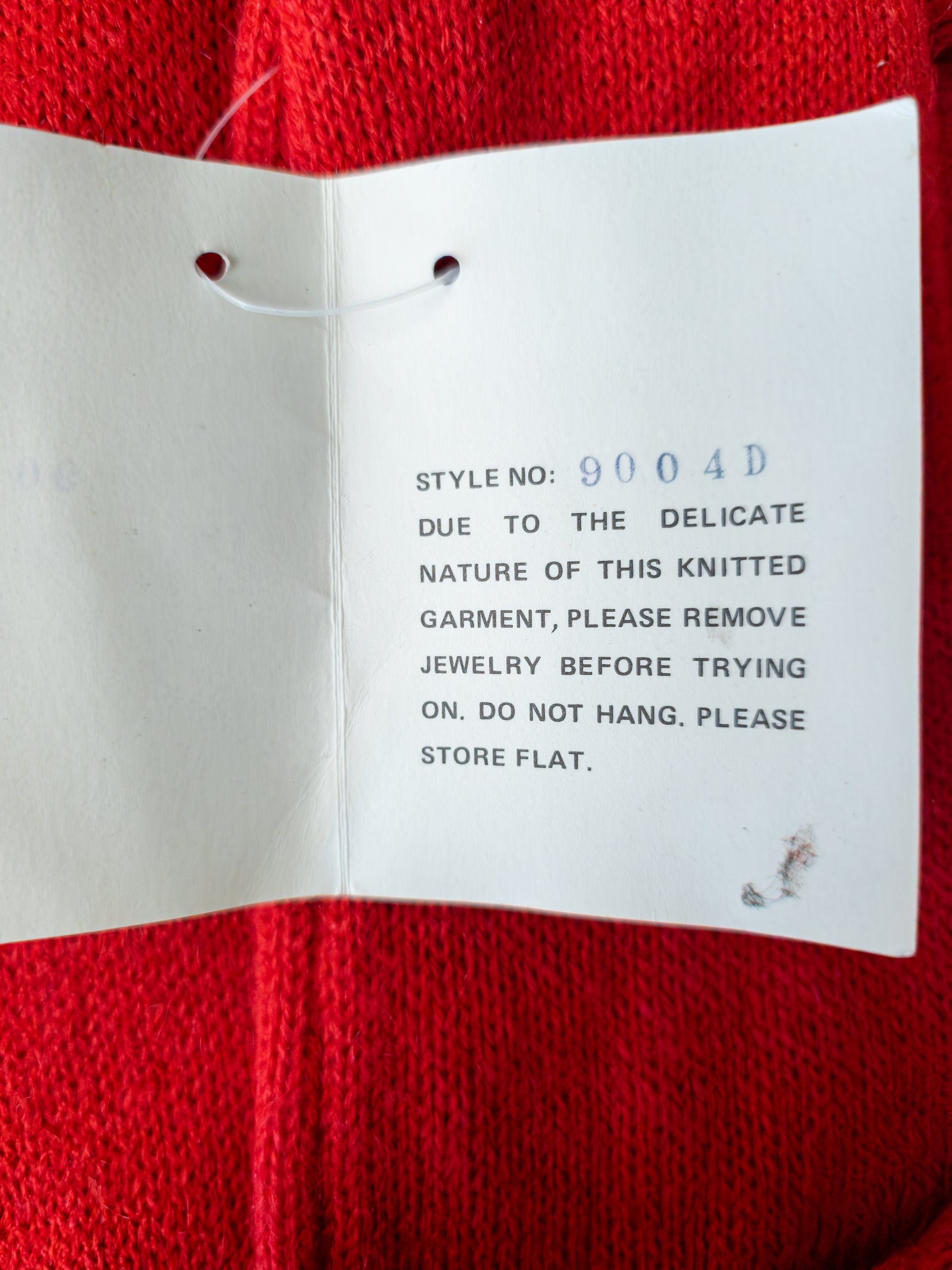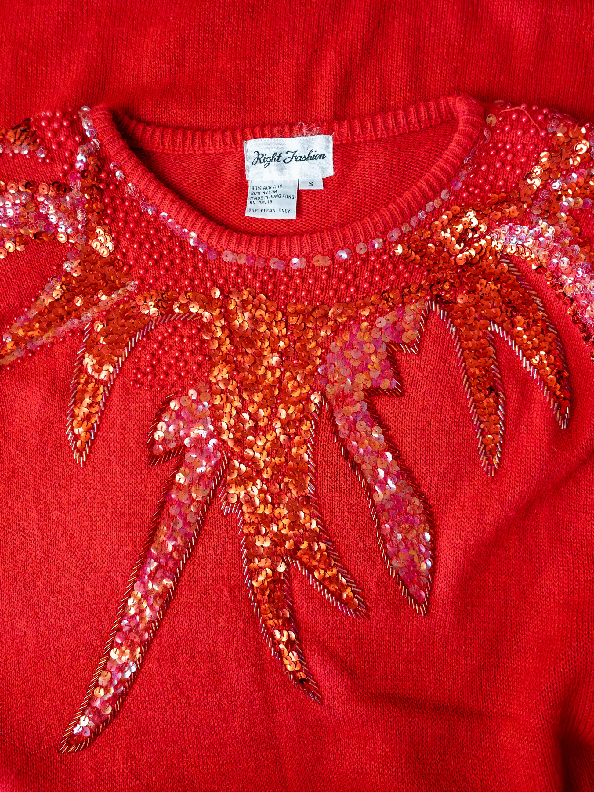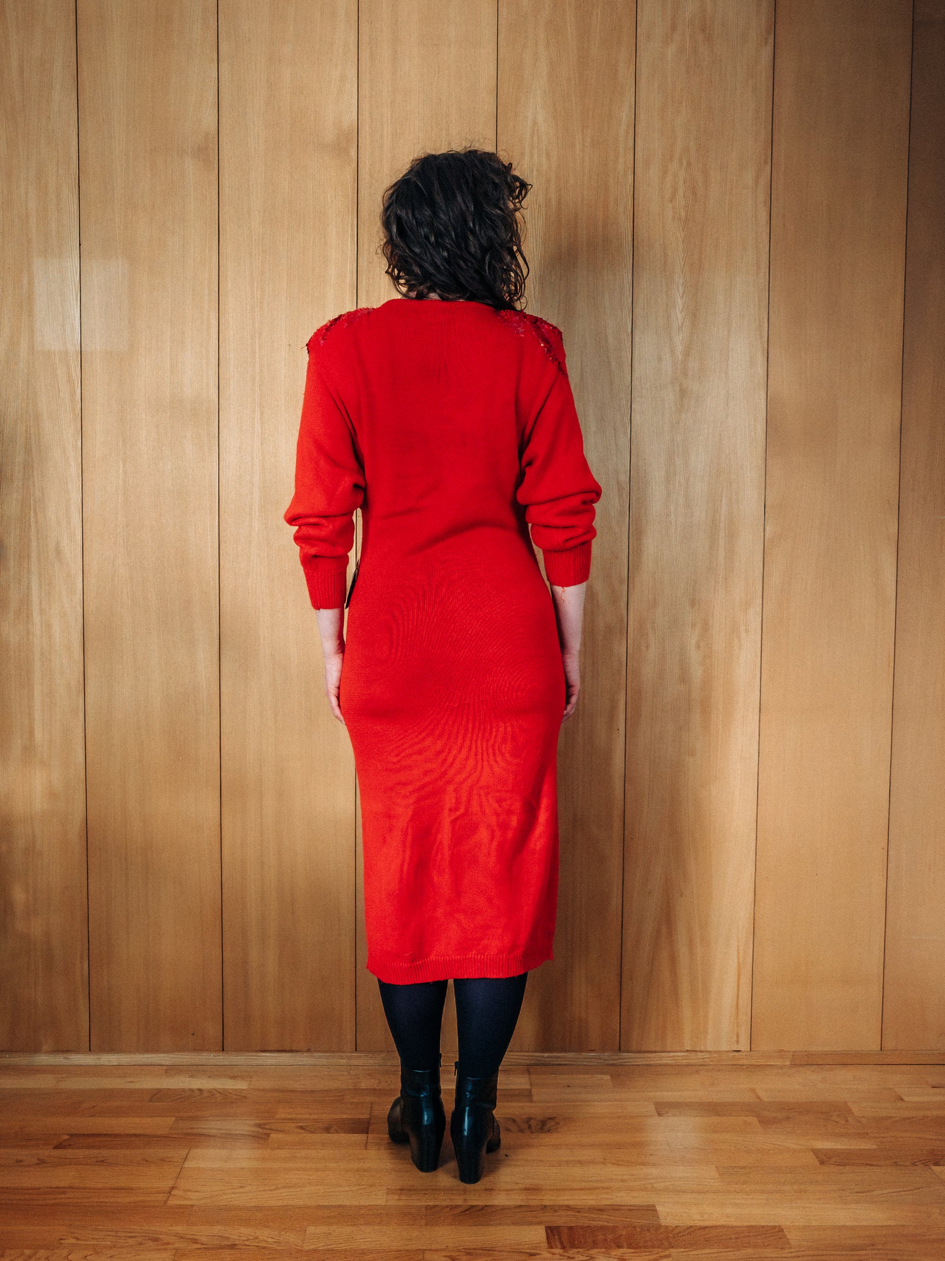 Ónotaður vintage 80s prjónakjóll frá Right fashion. Geggjaður rauður prjónakjóll með pallíettum og perlum. Klassískt 80s snið með axlarpúðum, doleman ermum en annars aðsniðinn bodycon kjóll. Kjóllinn er mjúkur úr blöndu af akrýl og nylon sem teygist vel. Ástand mjög gott. Ónotaður og enn með áföstum miðum (new old stock). Mjög sjaldgæfur fundur. Merkt stærð S en passar á líka á medium þar sem efnið teygist. Áætluð stærð S/M.