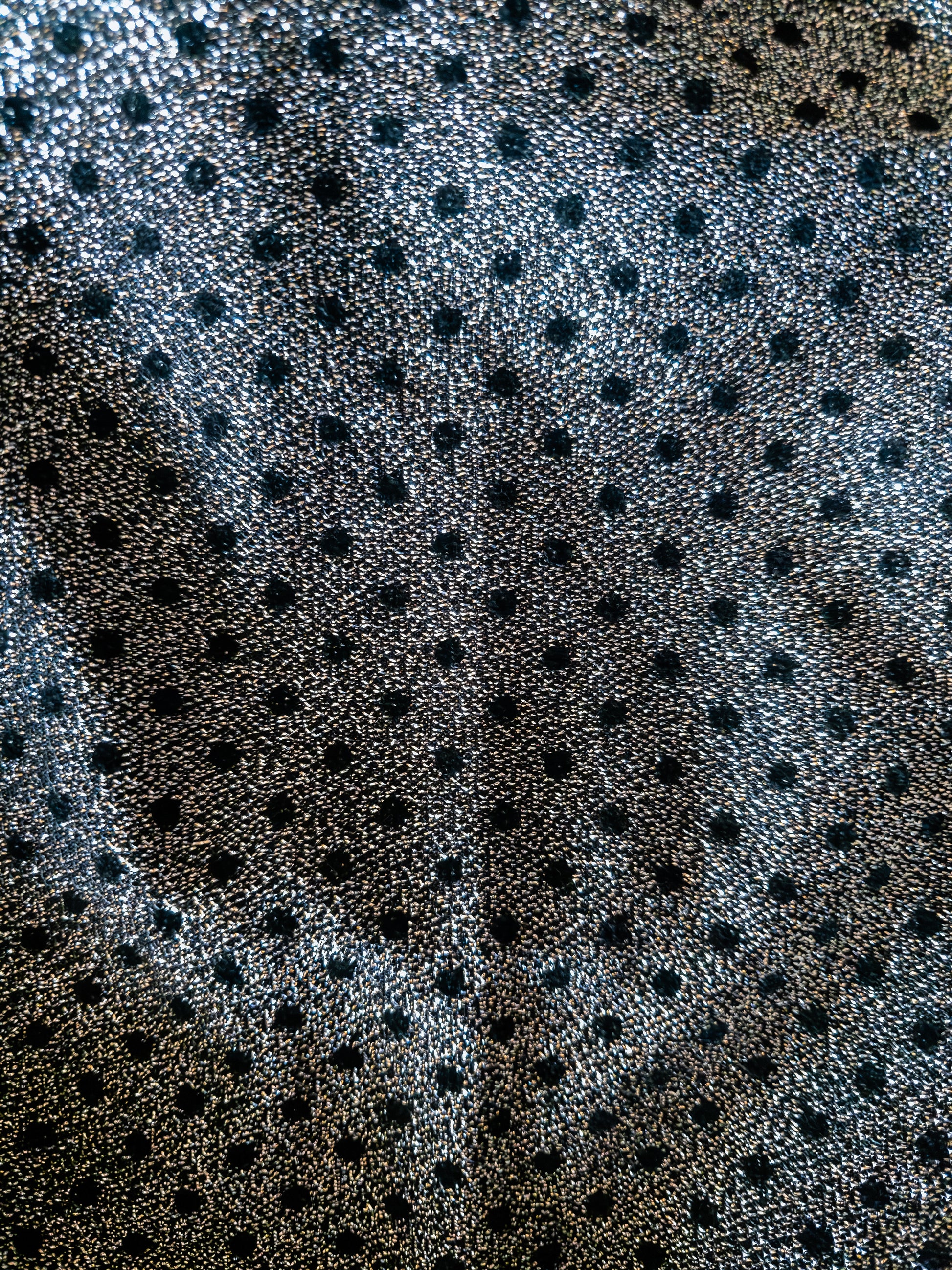 Vintage 80s silfur toppur. Einstakur toppur úr silfruðu efni með svörtum doppum úr flauel. Toppurinn er opinn í bakið, efnið fellur fallega og rammar inn bakið. Hálsmálið er hátt og smellt að aftan með glitrandi smellum. Toppurinn er með vítt snið, batwing ermar, siður og bundinn yfir mjaðmirnar. Klassískur 80s toppur. Ómerktur og líklegast heimasaumaður. Líklegast úr polyester. Engin teygja í efni. Ástand mjög gott. Sniðið á toppnum er afslappað og vítt yfir brjóst og mitti. Hvernig hann passar fer aðalega eftir mjaðmamálinu. Myndi segja að hann passi á stærðarbilið M - L (fyrirsætan er 180 cm á hæð og notar stærð M).