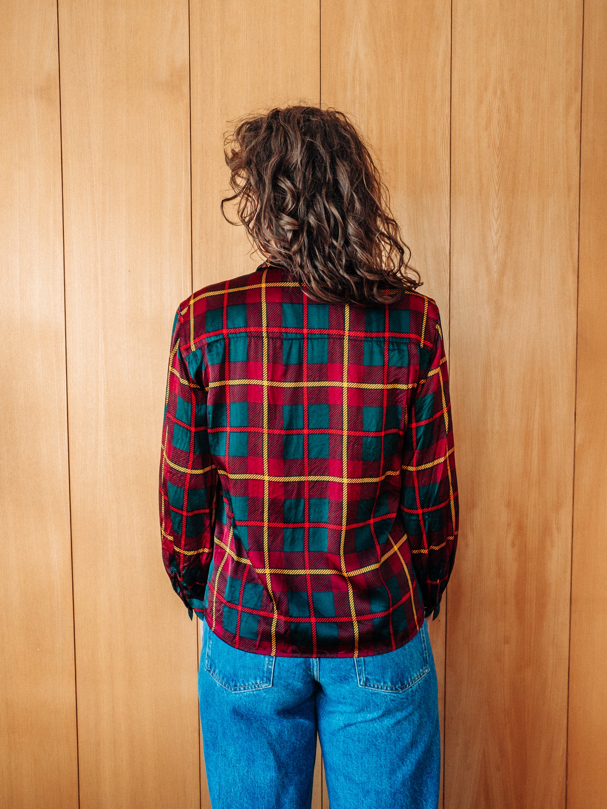 Vintage silkiskyrta frá Jones New York. Skyrtan er síðerma og hneppt, úr silkisatíni með flöskugrænu, dökkrauðu og gulu köflóttu munstri. 100% silki. Engin teygja í efni. Ástand mjög gott. Áætluð stærð Medium.