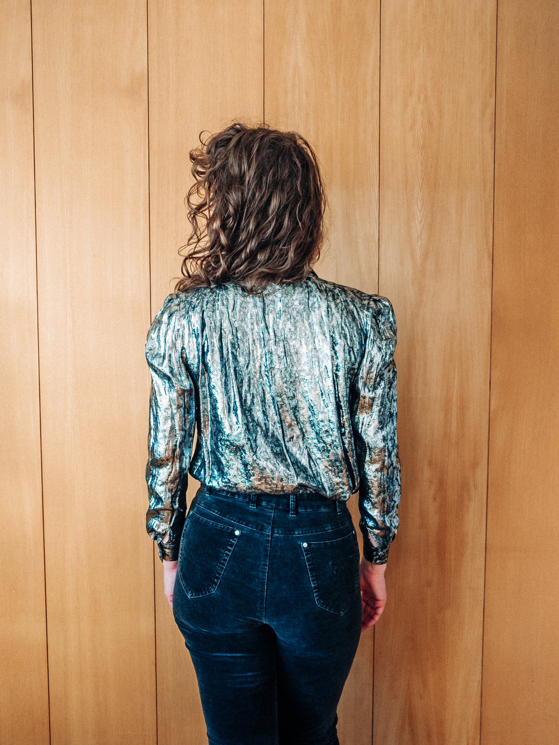 Vintage skyrta frá Louben. Skyrtan er úr silfruðu metallic efni. Klassíkt snið með axlarpúðum, síðerma og hneppt. Líklegast úr polyester. Engin teygja í efni. Ástand mjög gott fyrir utan að axlarpúðarnir eru farnir að molna (algengt með vintage svamp). Auðvelt er að fjarlægja þá eða setja nýja. Áætluð stærð S/M.