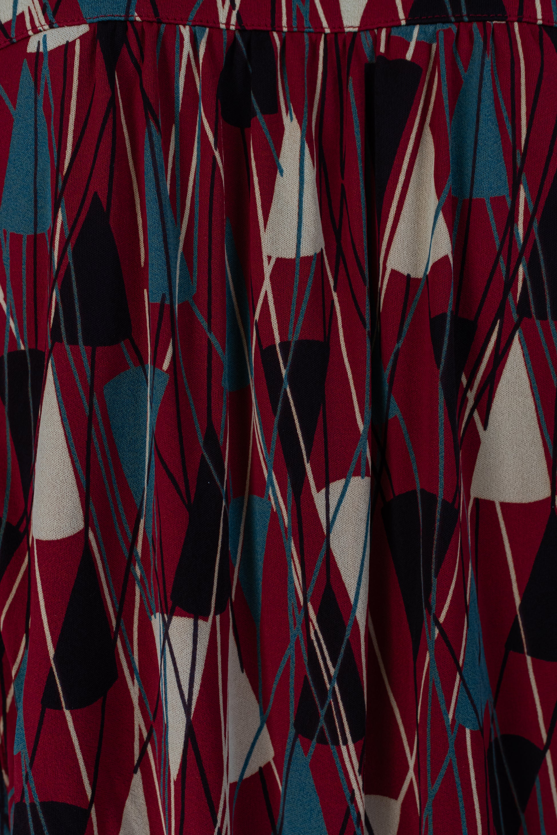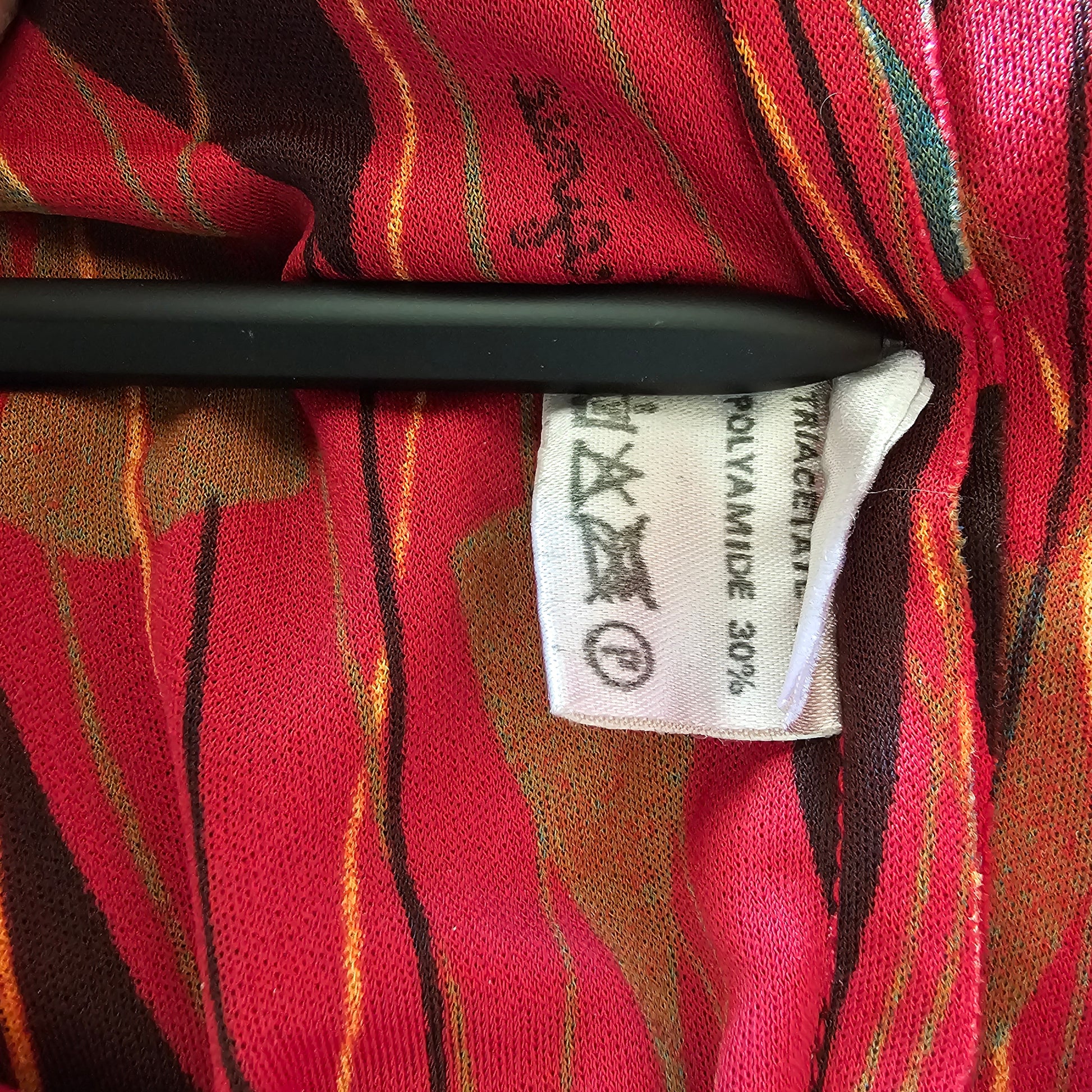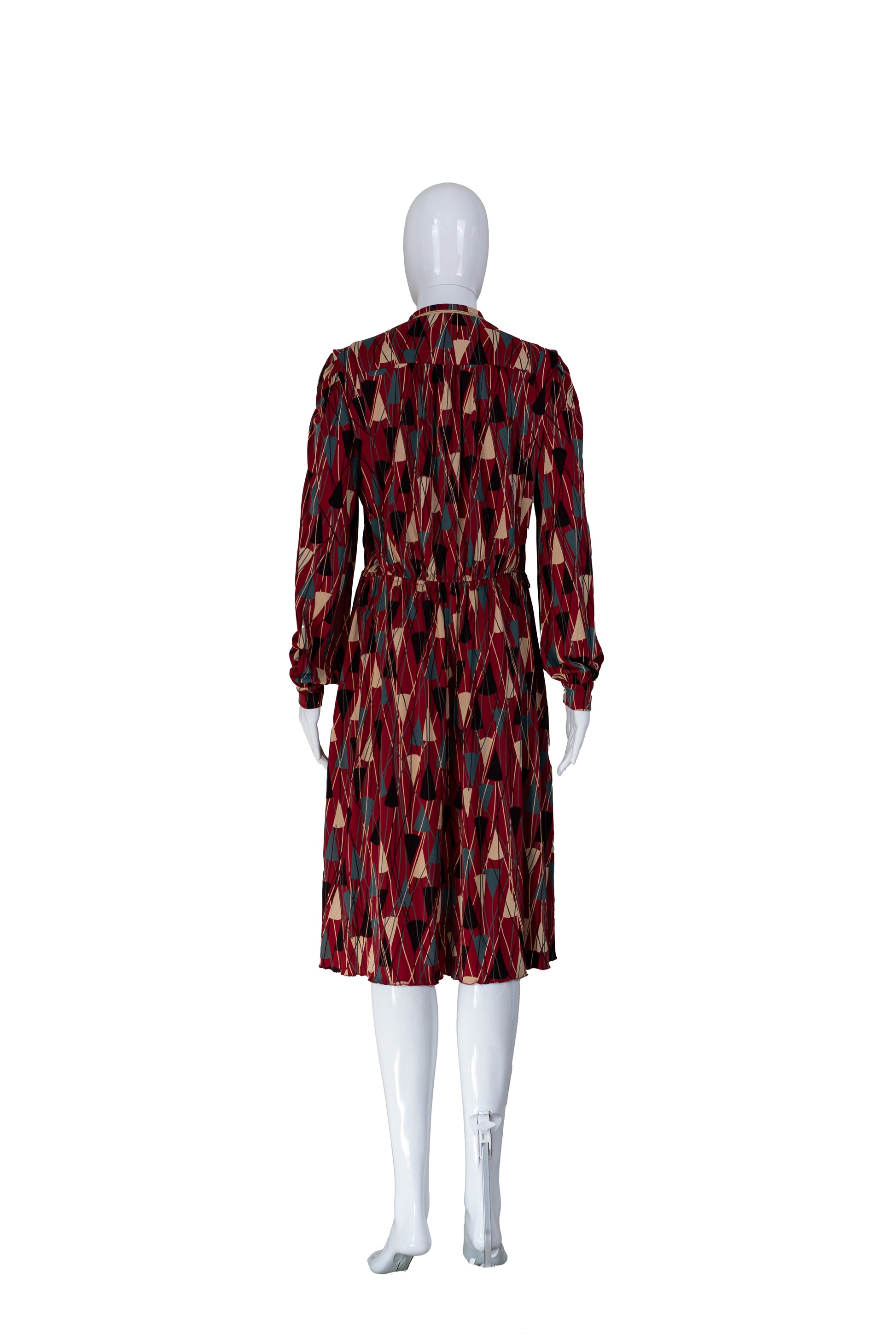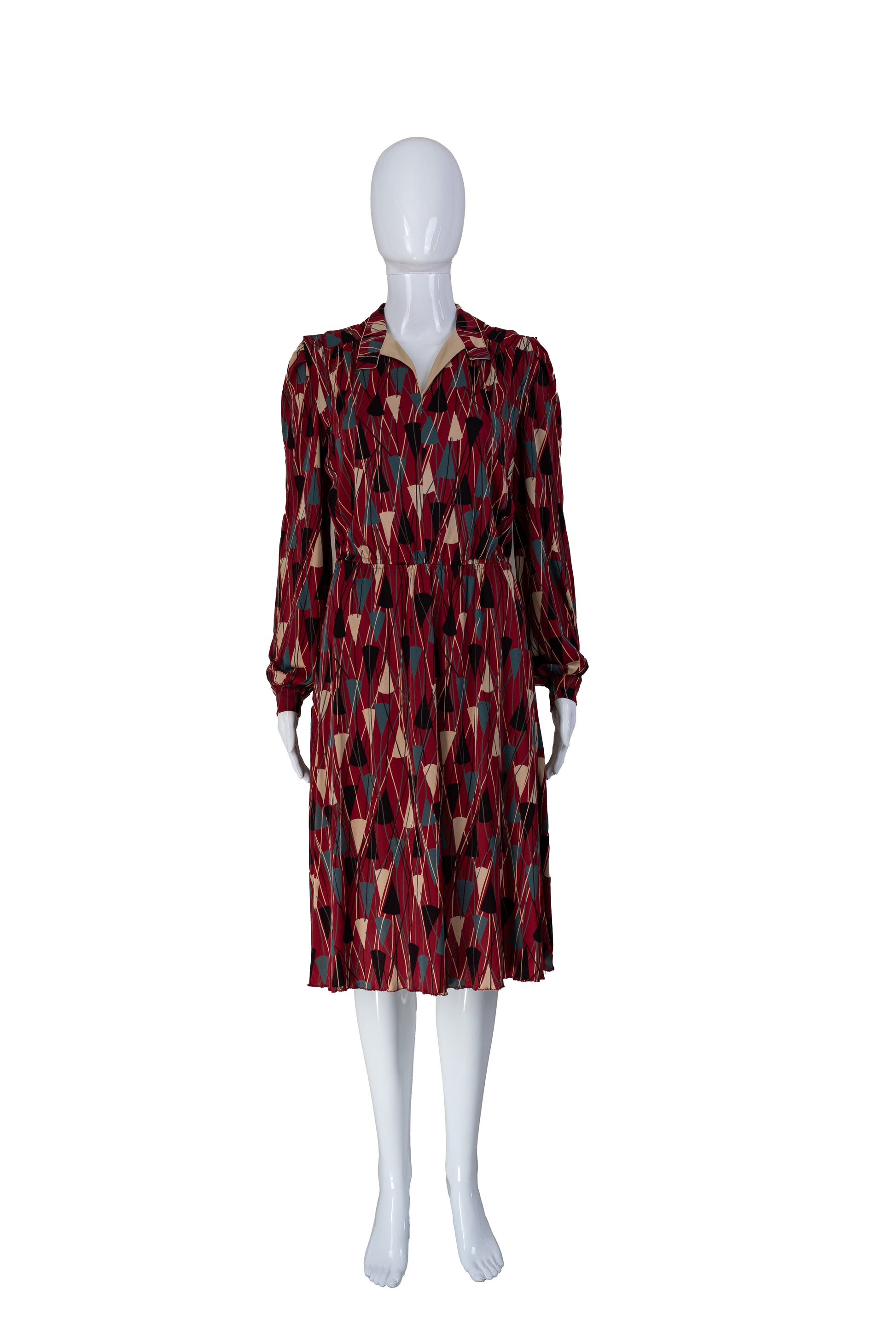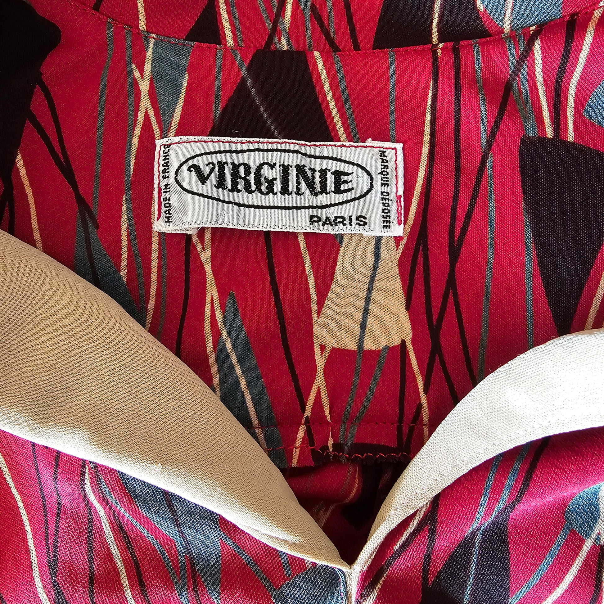 Rauður vintage Virginie de Paris kjóll með geometrísku munstri. Með vösum. 70% triacetate, 30% polyamide. Teygja í mitti og smá teygja í efni. Lykkjur fyrir belti. Ástand gott. Stærð M.