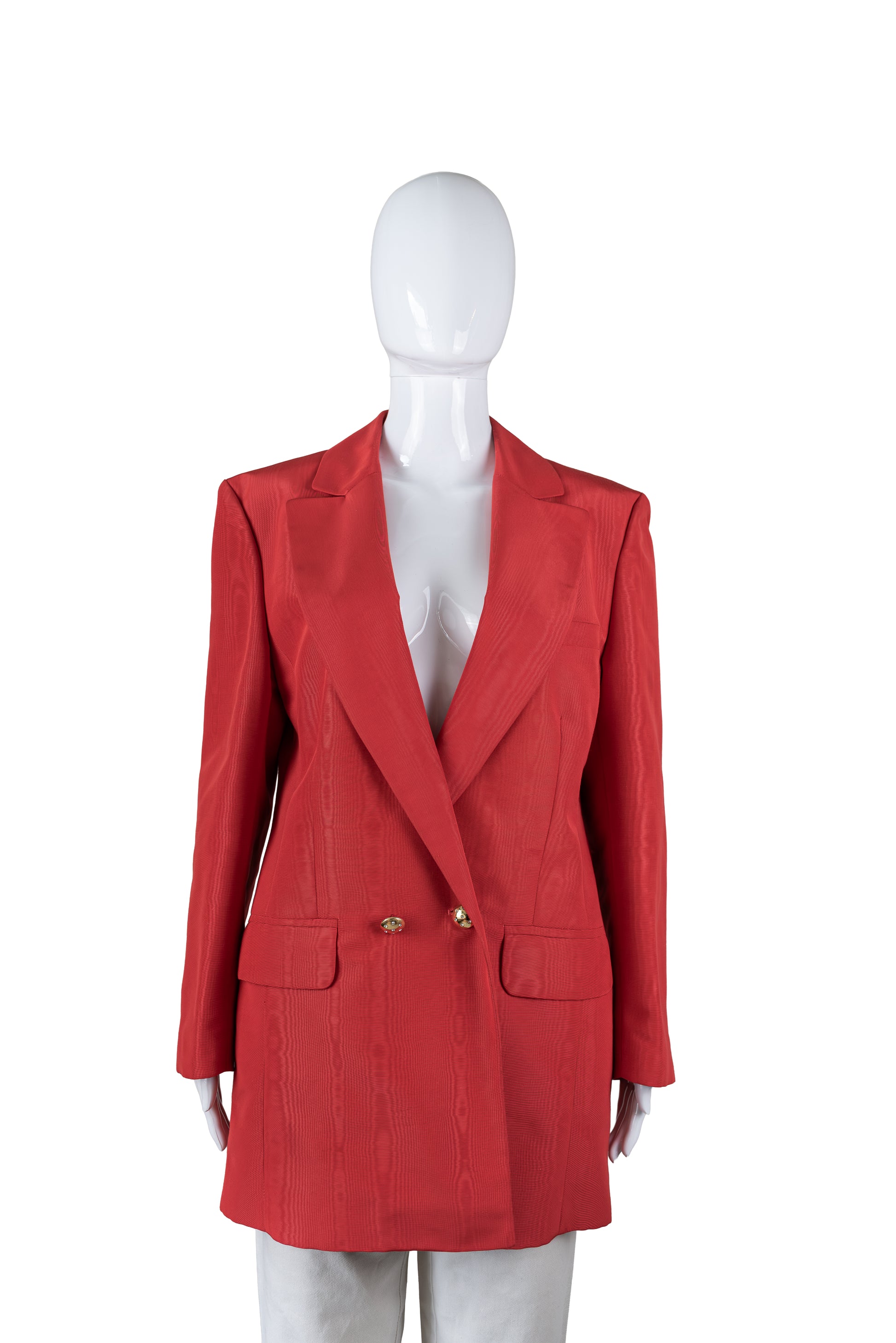 Yarell rauður vintage blazer. Tvíhnepptur með gylltum hnöppum. Aðsniðinn með þunnum axlarpúðum. 100% polyester. Ástand mjög gott. Merkt stærð 38. Mæld stærð S.