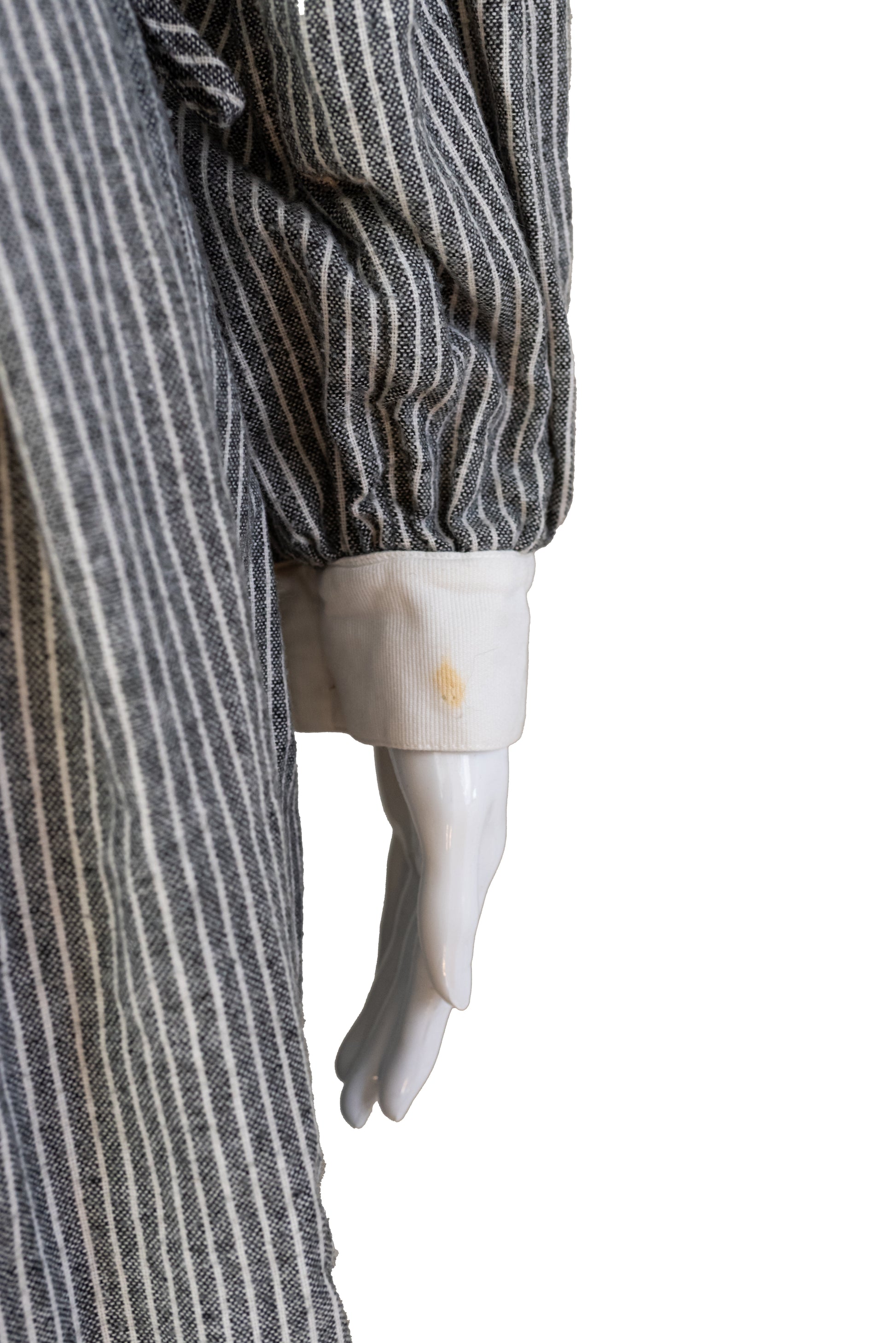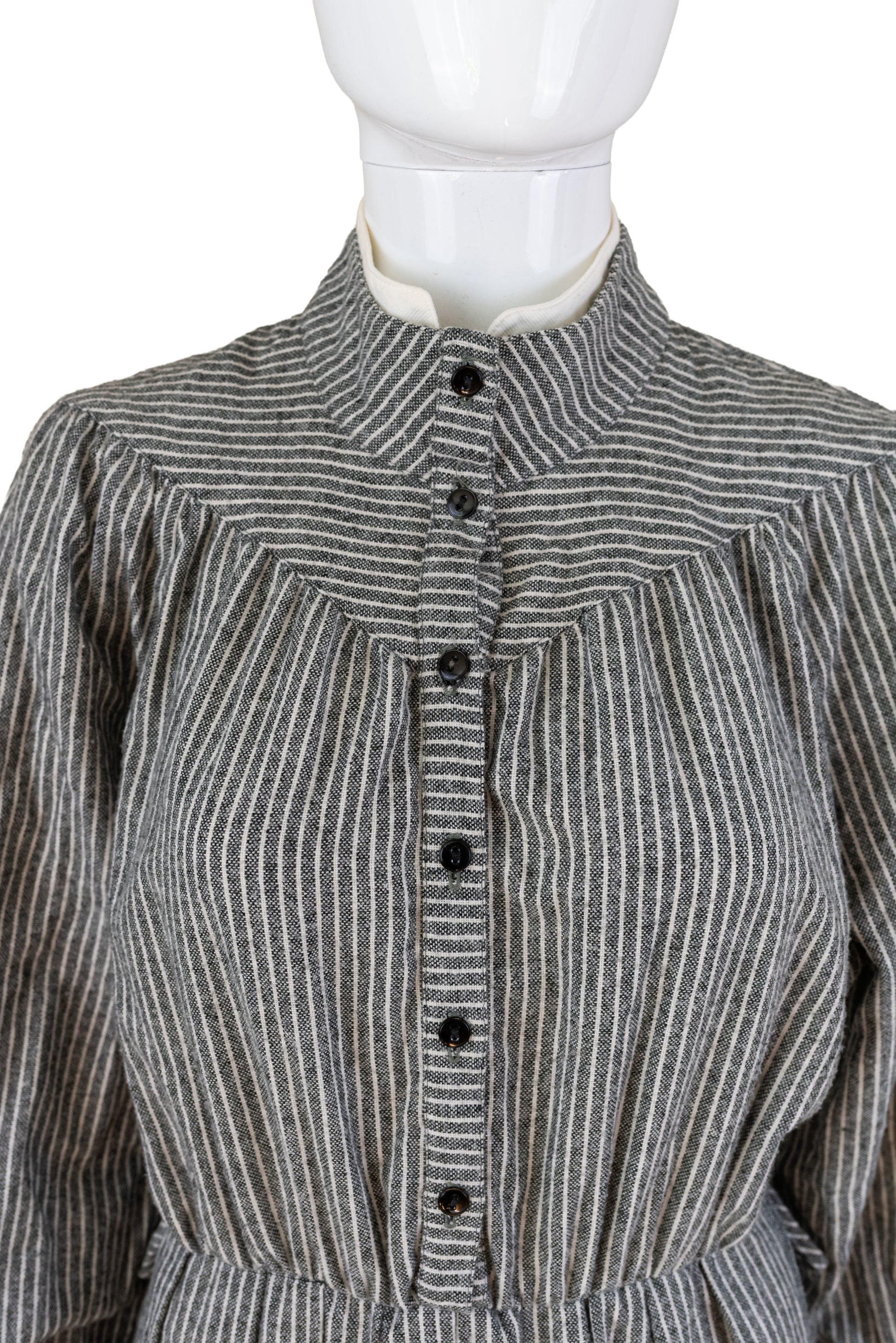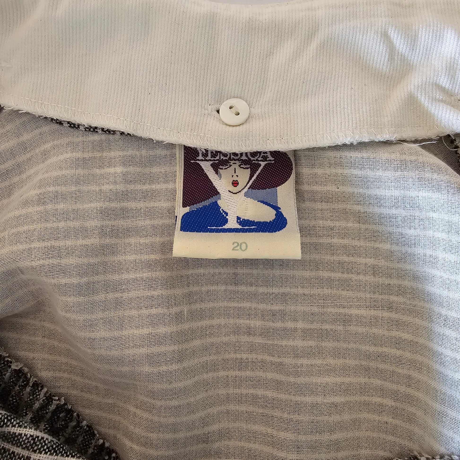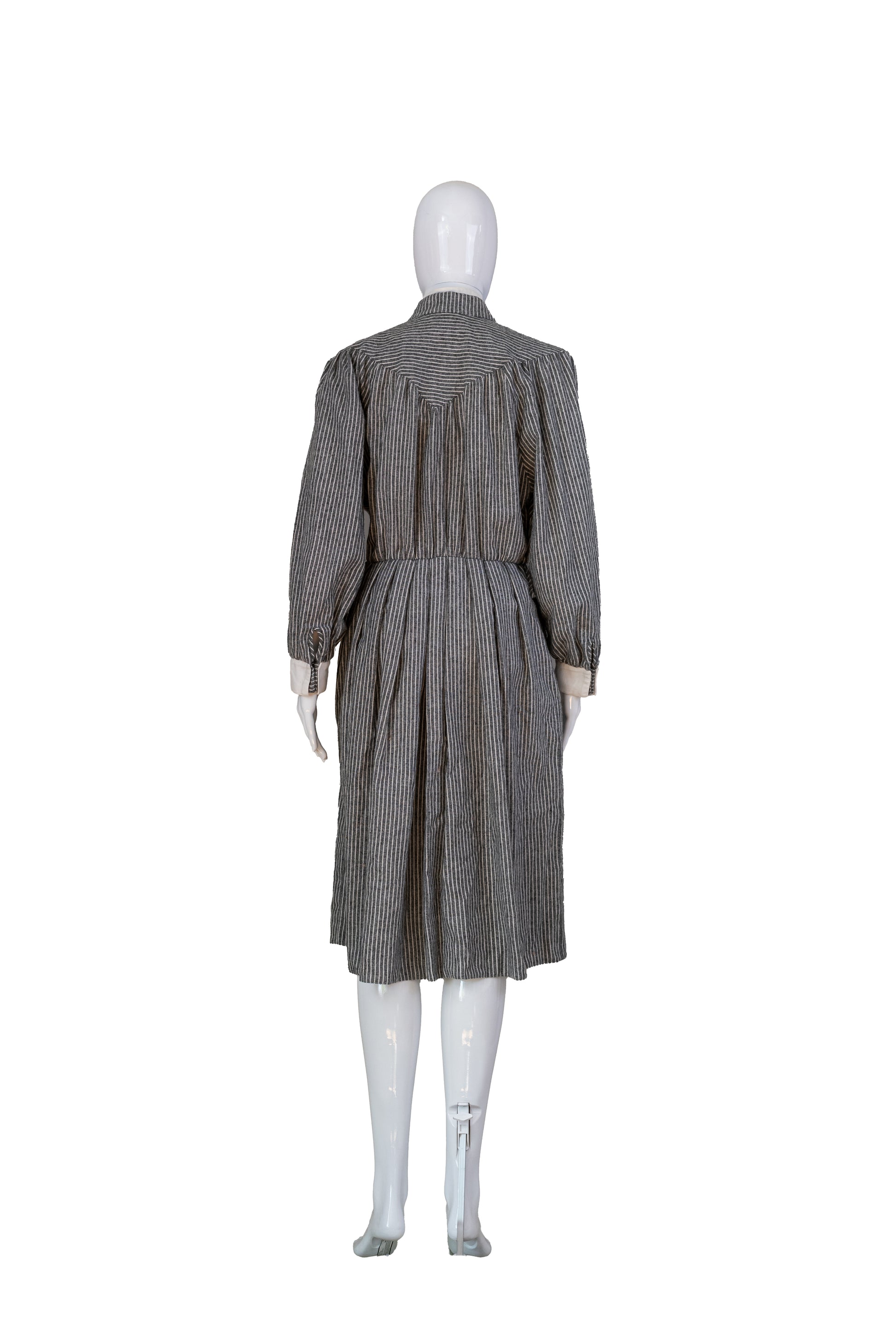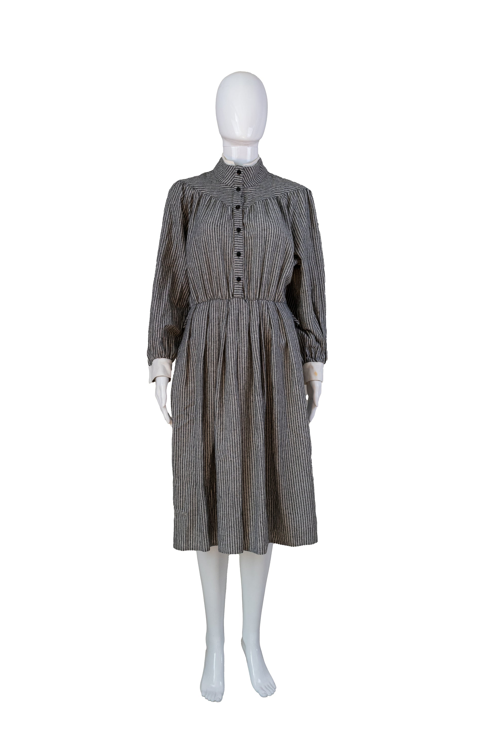 Vintage Yessica, 80s grá-röndóttur kjóll úr ullarblöndu. Renndur á hlið. Með vasa hægra megin. Teygja í mitti. Lykkjur fyrir belti. Með vasa hægra megin. Efni teygist ekki. Ástand gott. Smá blettur á ermi (sjá mynd). Kjóllinn er merktur stærð 20 en passar á M.