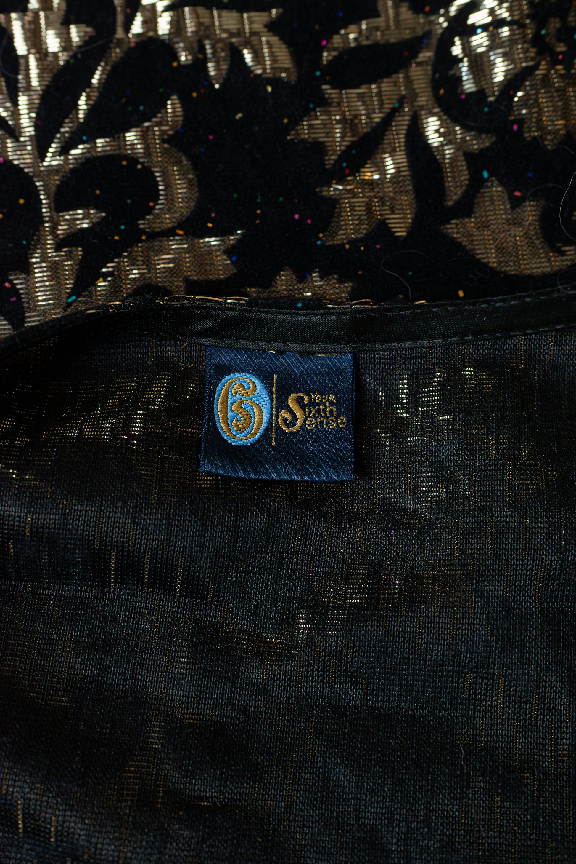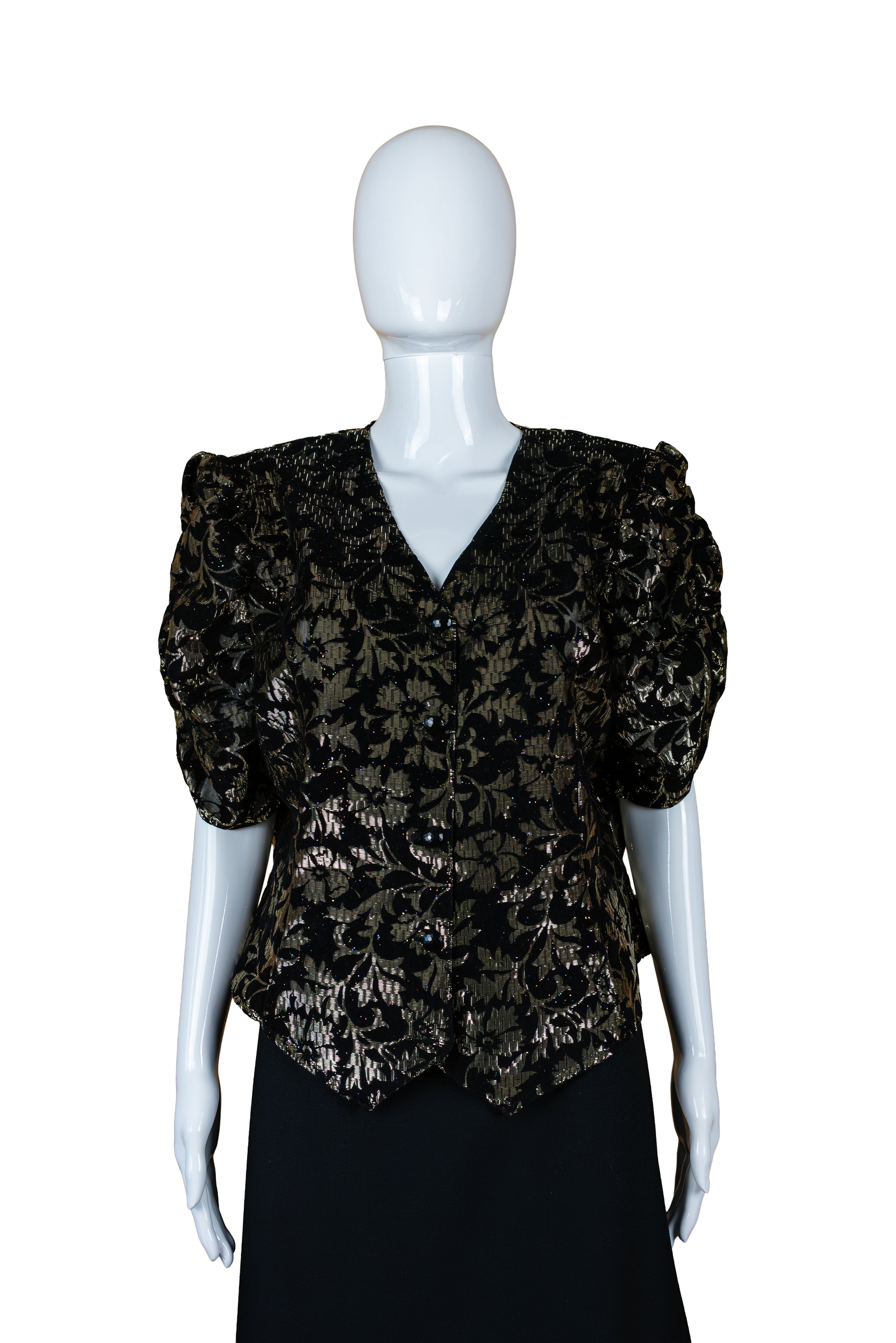 Your sixth sense vintage 80s blússa. Með púffermum og stórum axlarpúðum. Alvöru 80s. Úr svörtu flaueli og gylltu metallic efni. Hneppt. Úr 80% viskós og 20% metallic. Merkt stærð 20. Áætluð stærð XL.